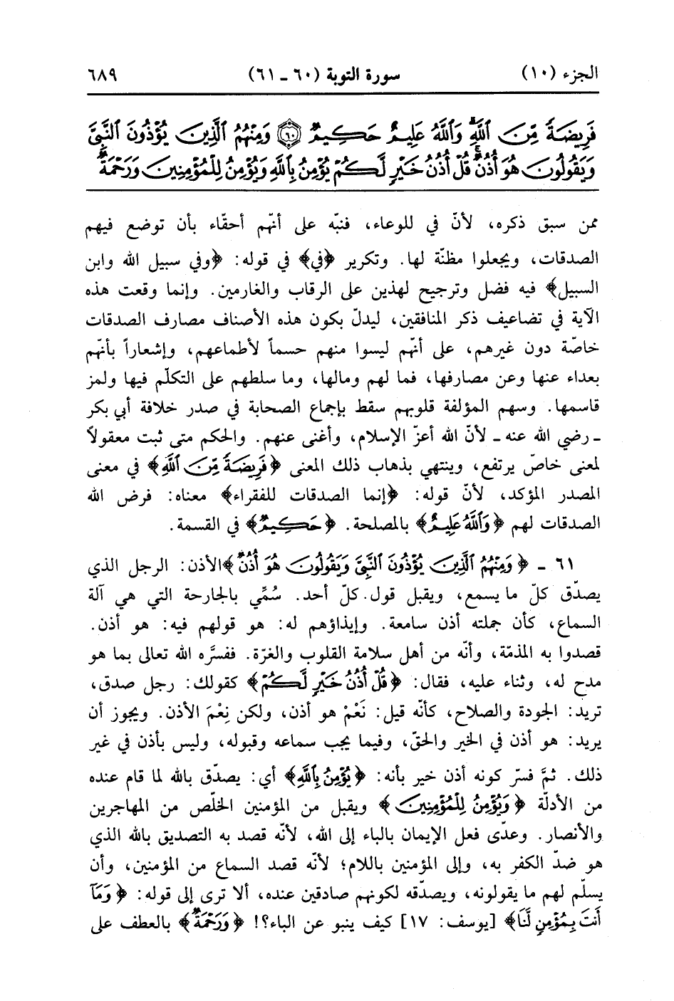 وَمِنْهُمُ الَّذِينَ يُؤْذُونَ النَّبِيَّ وَيَقُولُونَ هُوَ أُذُنٌ قُلْ أُذُنُ خَيْرٍ لَكُمْ يُؤْمِنُ بِاللَّهِ وَيُؤْمِنُ لِلْمُؤْمِنِينَ وَرَحْمَةٌ لِلَّذِينَ آمَنُوا مِنْكُمْ وَالَّذِينَ يُؤْذُونَ رَسُولَ اللَّهِ لَهُمْ عَذَابٌ أَلِيمٌ (61)