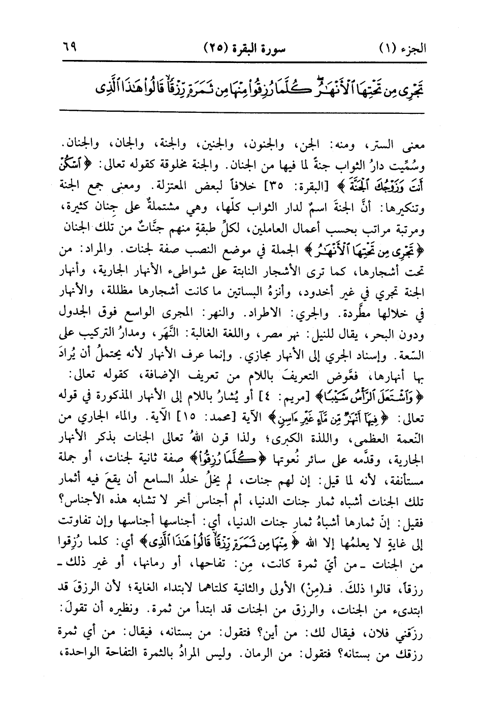 معنى الستر ومنه الجن والجنون والجنين والجنة والجان والجنان وسميت دار الثواب جنة لما فيها من الجنان والجنة مخلوقة لقوله تعالى {اسكن أَنتَ وزَوْجُكَ الجنة} خلافاً لبعض المعتزلة ومعنى جمع الجنة وتنكيرها أن الجنة اسم لدار الثواب كلها وهي متشلمة على جنان كثيرة مرتبة مراتب بحسب أعمال العاملين لكل طبقة منهم جنات من تلك الجنان {تَجْرِي مِن تَحْتِهَا الأنهار} الجملة في موضع النصب صفة لجنات والمراد من تحت أشجارها كما ترى الأشجار النابتة على شواطئ الأنهار الجارية وأنهار الجنة تجري في غير أخدود وأنزه البساتين ما كانت أشجارها مظلة والأنهار في خلالها مطردة والجري الأطراد والنهر المجرى الواسع فوق الجدول ودون البحر يقال للنيل نهر مصر واللغة العالية نهر ومدار التركيب على السعة وإسناد الجري إلى الأنهار مجازي وإنما عرف الأنهار لأنه يحتمل أن يراد بها أنهارها فعوض التعريف باللام من تعريف الإضافة كقوله تعالى واشتعل الرأس شيبا