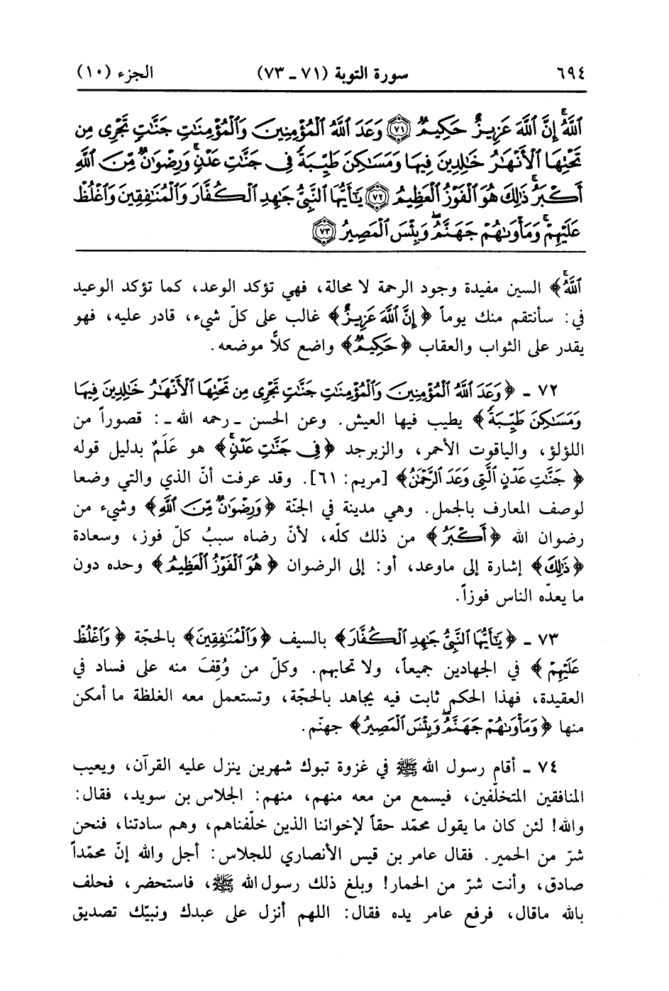 يَا أَيُّهَا النَّبِيُّ جَاهِدِ الْكُفَّارَ وَالْمُنَافِقِينَ وَاغْلُظْ عَلَيْهِمْ وَمَأْوَاهُمْ جَهَنَّمُ وَبِئْسَ الْمَصِيرُ (73)