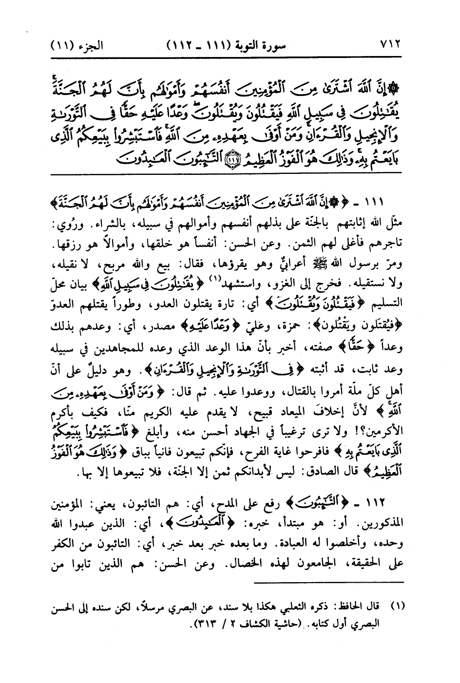 إِنَّ اللَّهَ اشْتَرَى مِنَ الْمُؤْمِنِينَ أَنْفُسَهُمْ وَأَمْوَالَهُمْ بِأَنَّ لَهُمُ الْجَنَّةَ يُقَاتِلُونَ فِي سَبِيلِ اللَّهِ فَيَقْتُلُونَ وَيُقْتَلُونَ وَعْدًا عَلَيْهِ حَقًّا فِي التَّوْرَاةِ وَالْإِنْجِيلِ وَالْقُرْآنِ وَمَنْ أَوْفَى بِعَهْدِهِ مِنَ اللَّهِ فَاسْتَبْشِرُوا بِبَيْعِكُمُ الَّذِي بَايَعْتُمْ بِهِ وَذَلِكَ هُوَ الْفَوْزُ الْعَظِيمُ (111)