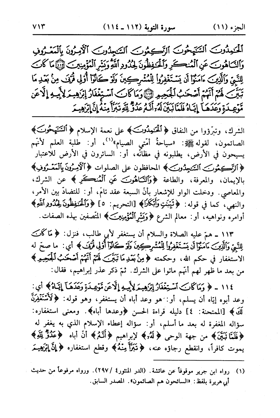 مَا كَانَ لِلنَّبِيِّ وَالَّذِينَ آمَنُوا أَنْ يَسْتَغْفِرُوا لِلْمُشْرِكِينَ وَلَوْ كَانُوا أُولِي قُرْبَى مِنْ بَعْدِ مَا تَبَيَّنَ لَهُمْ أَنَّهُمْ أَصْحَابُ الْجَحِيمِ (113)