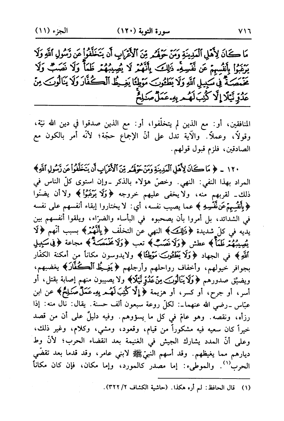 مَا كَانَ لِأَهْلِ الْمَدِينَةِ وَمَنْ حَوْلَهُمْ مِنَ الْأَعْرَابِ أَنْ يَتَخَلَّفُوا عَنْ رَسُولِ اللَّهِ وَلَا يَرْغَبُوا بِأَنْفُسِهِمْ عَنْ نَفْسِهِ ذَلِكَ بِأَنَّهُمْ لَا يُصِيبُهُمْ ظَمَأٌ وَلَا نَصَبٌ وَلَا مَخْمَصَةٌ فِي سَبِيلِ اللَّهِ وَلَا يَطَئُونَ مَوْطِئًا يَغِيظُ الْكُفَّارَ وَلَا يَنَالُونَ مِنْ عَدُوٍّ نَيْلًا إِلَّا كُتِبَ لَهُمْ بِهِ عَمَلٌ صَالِحٌ إِنَّ اللَّهَ لَا يُضِيعُ أَجْرَ الْمُحْسِنِينَ (120)