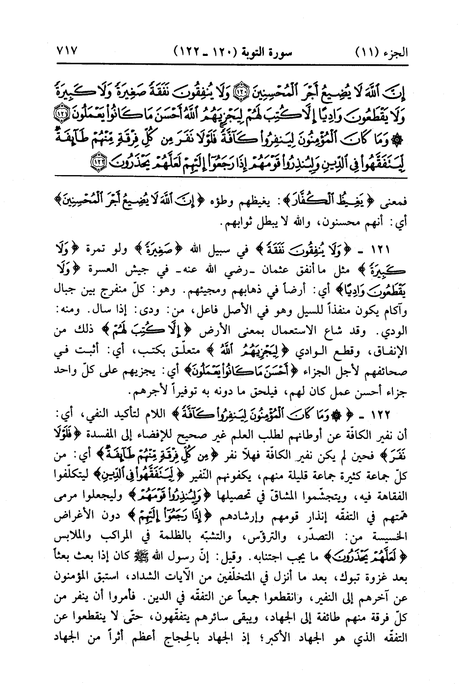 وَمَا كَانَ الْمُؤْمِنُونَ لِيَنْفِرُوا كَافَّةً فَلَوْلَا نَفَرَ مِنْ كُلِّ فِرْقَةٍ مِنْهُمْ طَائِفَةٌ لِيَتَفَقَّهُوا فِي الدِّينِ وَلِيُنْذِرُوا قَوْمَهُمْ إِذَا رَجَعُوا إِلَيْهِمْ لَعَلَّهُمْ يَحْذَرُونَ (122)