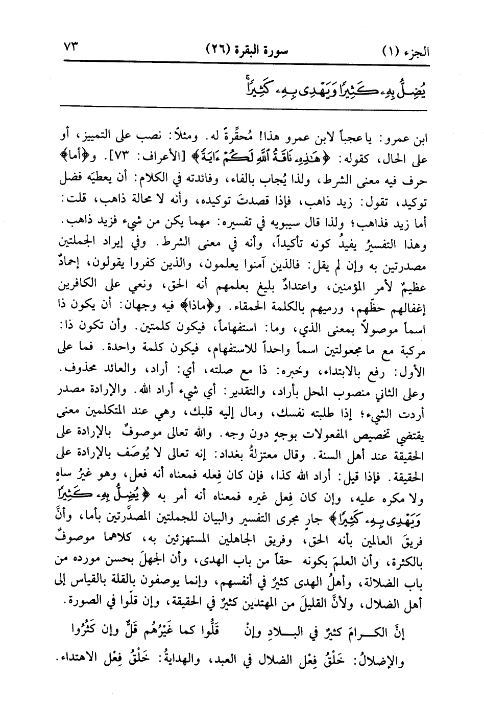 بن عمرو يا عجبا لابن عمر وهذا محقرة له ومثلا نصب على التمييز أو على الحال كقوله هذه ناقة الله لكم آية وأما حرف فيه معنى الشرط ولذا يجاب بالفاء وفائدته في الكلام أن يعطيه فضل توكيد تقول زيد ذاهب فإذا قصدت توكيده وأنه لا محالة ذاهب قلت أما زيد فذاهب ولذا قال سيبويه في تفسيره مهما يكن من شيء فزيد ذاهب وهذا التفسير يفيد كونه تأكيداً وأنه في معنى الشرط وفي إيراد الجملتين مصدرتين به وإن لم يقل فالذين آمنوا يعلمون والذين كفروا يقولون إحماد عظيم لأمر المؤمنين واعتداد بليغ بعلمهم أنه الحق ونعي على الكافرين إغفالهم حظهم ورميهم بالكلمة الحمقاء وماذا فيه وجهان أن يكون ذا اسماً موصولاً بمعنى الذى وما استفهاماً فيكون كلمتين وأن تكون ذا مركبة مع ما مجعولتين اسماً واحداً للاستفهام فيكون كلمة واحدة فما على الأول رفع بالابتداء وخبره ذا مع صلته أي أراد والعائد محذوف وعلى الثاني منصوب المحل بأراد والتقدير أي شيء أراد الله والإرادة مصدر أردت الشئ إذا طلبته نفسك ومال إليه قلبك وهي عند المتكلمين معنى يقتضي تخصيص المفعولات بوجه دون وجه والله تعالى موصوف بالإرادة على الحقيقة عند أهل السنة وقال معتزلة بغداد إنه تعالى لا يوصف بالإرادة على الحقيقة فإذا قيل أراد الله كذا فإن كان فعله فمعناه أنه فعل وهو غير ساهٍ ولا مكره عليه وإن كان فعل غيره فمعناه أنه أمر به {يُضِلُّ بِهِ كَثِيرًا وَيَهْدِي بِهِ كَثِيرًا} جارٍ مجرى التفسير والبيان للجملتين المصدرتين بأما وأن فريق العالمين بأنه الحق وفريق الجاهلين المستهزئين به كلاهما موصوف بالكثرة وأن العلم بكونه حقاً من باب الهدى وأن الجهل بحسن موروده من باب الضلالة وأهل الهدى كثير في أنفسهم وإنما يوصفون بالقلة بالقياس إلى أهل الضلال ولأن القليل من المهتدين كثير في الحقيقة وإن قالوا في الصورة ... إن الكرام كثير في البلاد وإن ... قلوا كما غيرهم قل وإن كثروا ...
