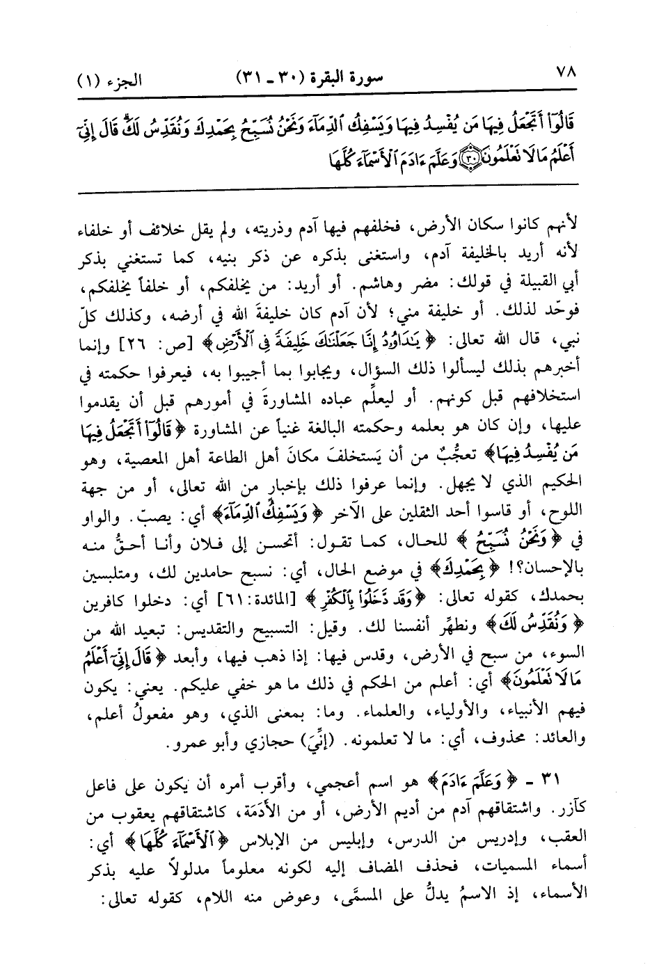 لأنهم كانوا سكان الأرض فخلقهم فيها آدم وذريته ولم يقل خلاف أو خلفاء لأنه أريد بالخليفة آدم واستغنى بذكره عن ذكر بنيه كما تستغني بذكر أبي القبيلة في قولك مضر وهاشم أو اريد من يخلفكم أو خلفا يخلفكم فوحد لذلك أو خليفة مني لأن آدم كان خليفة الله في أرضه وكذلك كل نبى قال الله تعالى {يا داود إنا جعلناك خليفة في الأرض} وإنما أخبرهم بذلك ليسألوا ذلك السؤال ويجابوا بما أجيبوا به فيعرفوا حكمته في استخلافهم قبل كونهم أو ليعلِّم عباده المشاورة في أمورهم قبل أن يقدموا عليها وإن كان هو بعلمه وحكمته البالغة غنياً عن المشاورة {قَالُواْ أَتَجْعَلُ فِيهَا مَن يُفْسِدُ فِيهَا} تعجب من أن يستخلف مكان أهل الطاعة أهل المعصية وهو الحكيم الذي لا يجهل وإنما عرفوا ذلك بإخبار من الله تعالى أو من جهة اللوح أو قاسوا أحد الثقلين على الآخر {وَيَسْفِكُ الدماء} أي يصب والواو في {وَنَحْنُ نُسَبِّحُ} للحال كما تقول أتحسن إلى فلان وأنا أحق منه بالإحسان {بِحَمْدِكَ} في موضع الحال أي نسبح حامدين لك ومتلبسين بحمدك كقوله تعالى {وَقَدْ دَّخَلُواْ بالكفر} أي دخلوا كافرين {وَنُقَدِّسُ لَكَ} ونطهر أنفسنا لك وقيل التسبيح والتقديس تبعيد الله من السوء من سبح في الأرض وقدس فيها إذا ذهب فيها وأبعد {قَالَ إِنّي أَعْلَمُ مَا لاَ تَعْلَمُونَ} أي أعلم من الحكم في ذلك ما هو خفي عليكم يعني يكون فيهم الأنبساء والأولياء والعلماء وما بمعنى الذي وهو مفعول أعلم والعائد محذوف أى مالا تعلمونه إنى حجازى وأبو عمرو