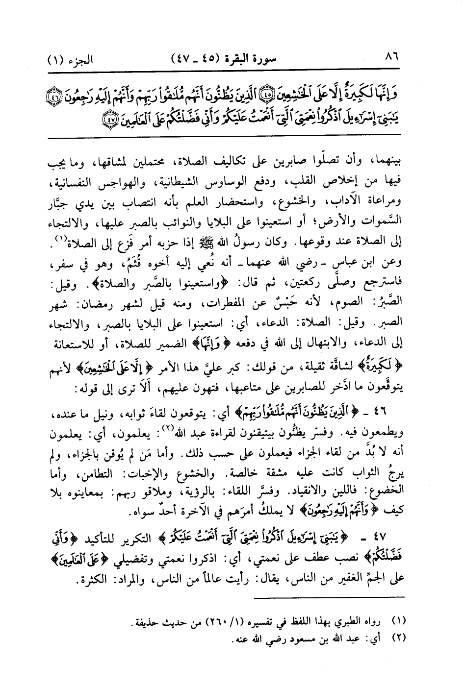 والنوائب بالصبر عليها والالتجاء إلى الصلاة عند وقوعها وكان رسول الله صلى الله عليه وسلم إذا حزبه أمر فزع إلى الصلاة وعن ابن عباس رضى الله عنهما أنه نعى إليه أخوه وقثم وهو في سفر فاسترجع وصلى ركعتين ثم قال واستعينوا بالصبر والصلاة وقيل الصبر الصوم لأنه حبس عن المفطرات ومنه قيل لشهر رمضان شهر الصبر وقيل الصلاة الدعاء أي استعينوا على البلايا بالصبر والالتجاء إلى الدعاء والابتهال إلى الله في دفعه {وَإِنَّهَا} الضمير للصلاة أو للاستعانة {لَكَبِيرَةٌ} لشاقة ثقيلة من قولك كبر عَلَيَّ هذا الأمر {إِلاَّ عَلَى الخاشعين} لأنهم يتوقعون ما ادخر للصابرين على متاعبها فتهون عليهم ألا ترى إلى قوله