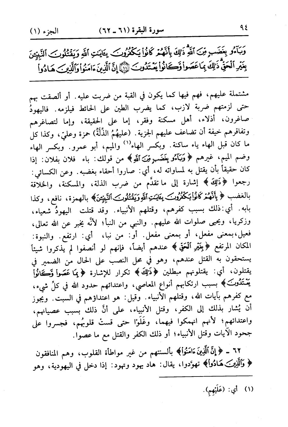مشتملة عليهم فهم فيها كما يكون في القبة من ضربت عليه أو ألصقت بهم حتى لزمتهم ضربة لازب كما يضرب الطين على الحائط فيلزمه فاليهود صاغرون أذلاء أهل مسكنة وفقر إما على الحقيقة وإما لتصاغرهم وتفاقرهم خيفة أن تضاعف عليهم الجزية عليهم الذلة حمزة وعلي وكذا كل ما كان قبل الهاء ياء ساكنة وبكسر الهاء والميم أبو عمرو وبكسر الهاء وضم الميم غيرهم {وباؤوا بِغَضَبٍ مِّنَ الله} من قولك باء فلان بفلان إذا كان حقيقيا بأن يقتل به لمساواته له أي صاروا أحقاء بغضبه وعن الكسائي حفوا {ذلك} إشارة إلى ما تقدم من ضرب الذلة والمسكنة والخلاقة بالغضب {بِأَنَّهُمْ كَانُواْ يَكْفُرُونَ بآيات الله وَيَقْتُلُونَ النبيين} بالهمزة نافع وكذا بابه أي ذلك بسبب كفرهم وقتلهم الأنبياء وقد قتلت اليهود شعياء وزكريا ويحيا صلوات الله عليهم والنبي من النبإ لأنه يخبر عن الله تعالى فعيل بمعنى مفِعل أو بمعنى مفعَل أو من نبا أي ارتفع والنبوة المكان المرتفع {بِغَيْرِ الحق} عندهم أيضا فإنهم لو أنصفوا لم يذكورا شيئاً يستحقون به القتل عندهم في التوراة وهو في محل النصب على الحال من الضمير في يقتلون أي يقتلونهم مبطلين {ذلك} تكرار للإشارة {بِمَا عَصَواْ وَّكَانُواْ يَعْتَدُونَ} بسبب ارتكابهم أنواع المعاصي واعتدائهم حدود الله في كل شيء مع كفرهم بآيات الله وقتلهم الأنبياء وقيل هو اعتداؤهم