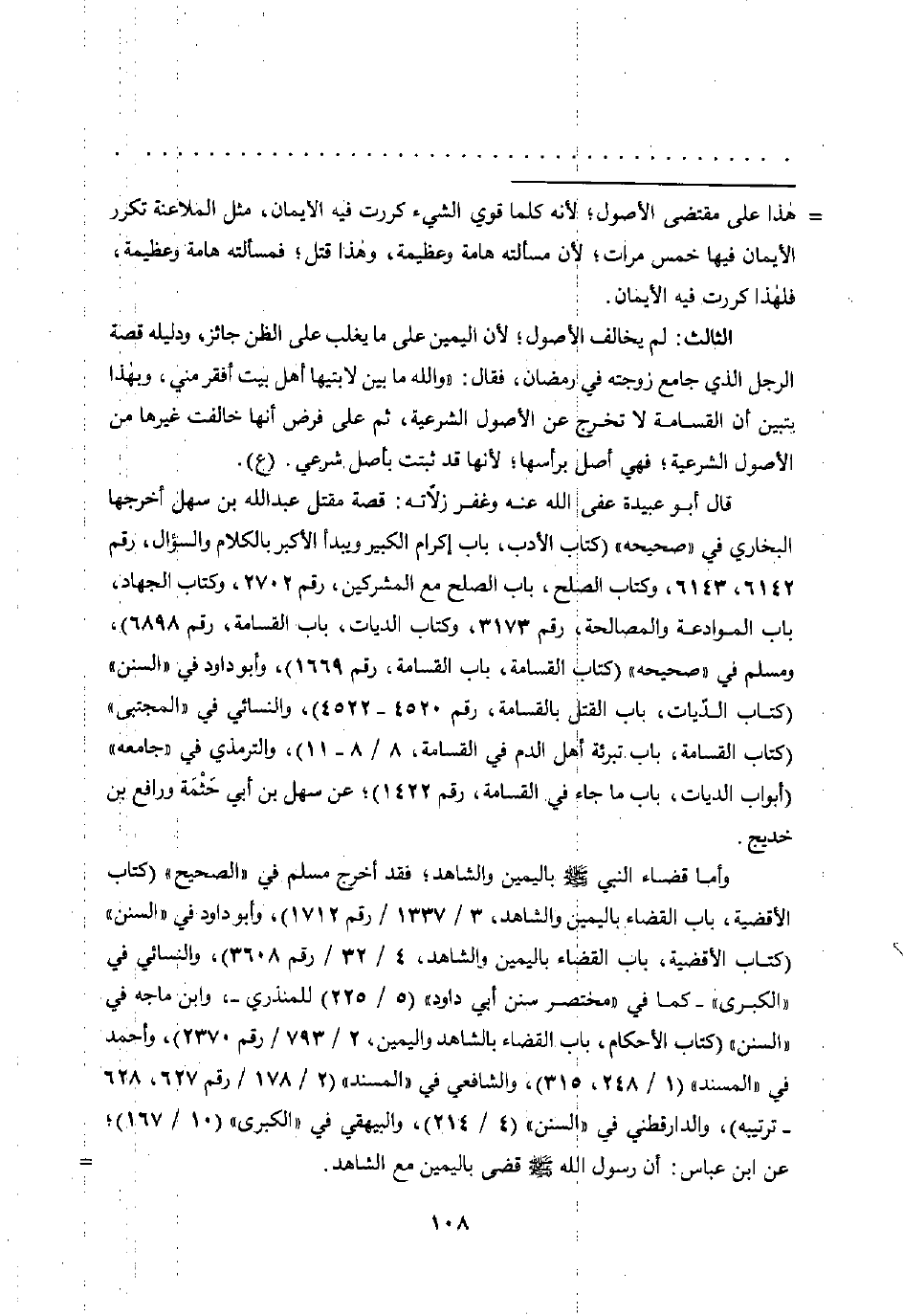 الثالث: لم يخالف الأصول؛ لأن اليمين على ما يغلب على الظن جائز، ودليله قصة الرجل الذي جامع زوجته في رمضان، فقال: "واللَّه ما بين لابتيها أهل بيت أفقر مني، وبهذا يتبين أن القسامة لا تخرج عن الأصول الشرعية، ثم على فرض أنها خالفت غيرها من الأصول الشرعية؛ فهي أصل برأسها؛ لأنها قد ثبتت بأصل شرعي. (ع).