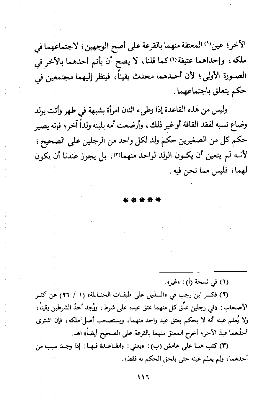 (¬2) ذكر ابن رجب في "الذيل على طبقات الحنابلة" (1/ 26) عن أكثر الأصحاب: "في رجلين علَّق كل منهما عتق عبده على شرط، ووُجد أحدُ الشرطين يقينًا، ولا يُعلم عينه أنه لا يحكم بعتق عبد واحد منهما، ويستصحب أصل ملكه، فإن اشترى أحدُهما عبدَ الآخر؛ أخرج المعتق منهما بالقرعة على الصحيح أيضًا" اهـ.