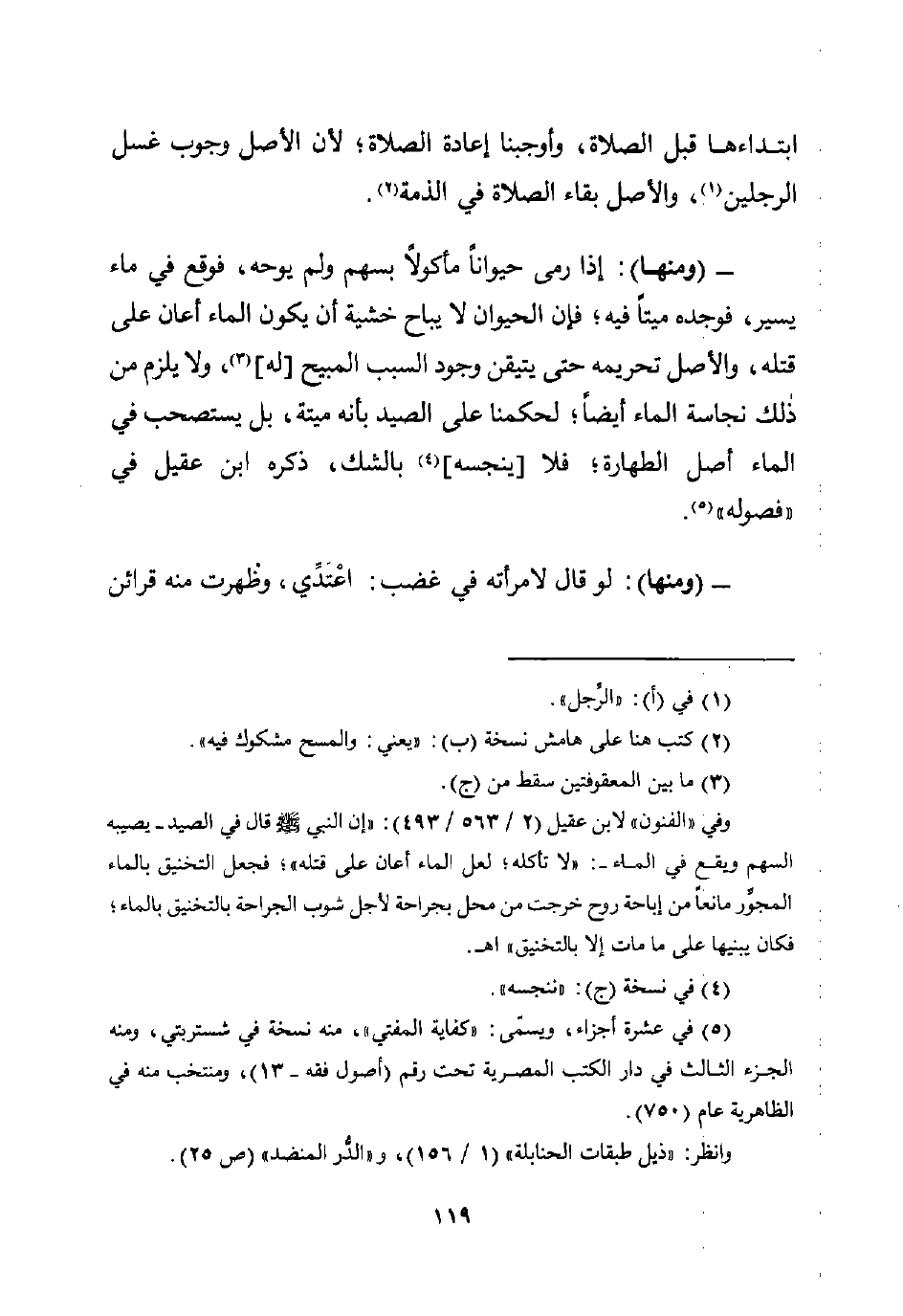 - (ومنها): إذا رمى حيوانًا مأكولًا بسهم ولم يوحه، فوقع في ماء يسير، فوجده ميتًا فيه؛ فإن الحيوان لا يباح خشية أن يكون الماء أعان على قتله، والأصل تحريمه حتى يتيقن وجود السبب المبيح [له] (¬3)، ولا يلزم من ذلك نجاسة الماء أيضًا؛ لحكمنا على الصيد بأنه ميتة، بل يستصحب في الماء أصل الطهارة؛ فلا [ينجسه] (¬4) بالشك، ذكره ابن عقيل في "فصوله" (¬5).