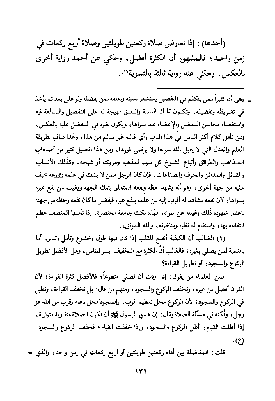 (أحدها): إذا تعارض صلاة ركعتين طويلتين وصلاة أربع ركعات في زمن واحد؛ فالمشهور أن الكثرة أفضل، وحكي عن أحمد رواية أخرى بالعكس، وحكي عنه رواية ثالثة بالتسوية (¬1).
