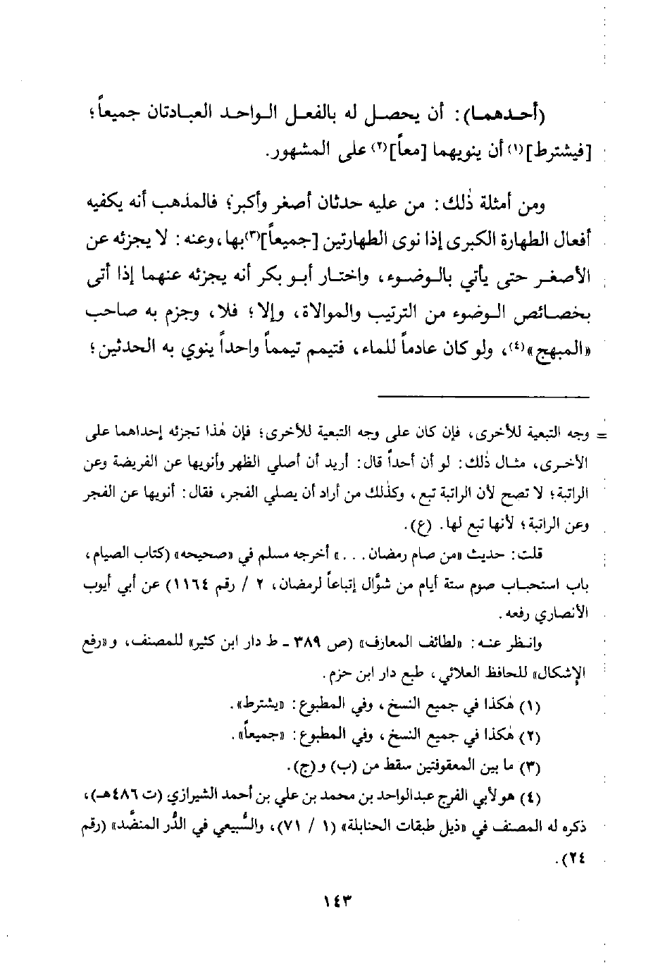 ومن أمثلة ذلك: من عليه حدثان أصغر وأكبر؛ فالمذهب أنه يكفيه أفعال الطهارة الكبرى إذا نوى الطهارتين [جميعًا] (¬3) بها، وعنه: لا يجزئه عن الأصغر حتى يأتي بالوضوء، واختار أبو بكر أنه يجزئه عنهما إذا أتى بخصائص الوضوء من الترتيب والموالاة، وإلا؛ فلا، وجزم به صاحب "المبهج" (¬4)، ولو كان عادمًا للماء، فتيمم تيممًا واحدًا ينوي به الحدثين؛