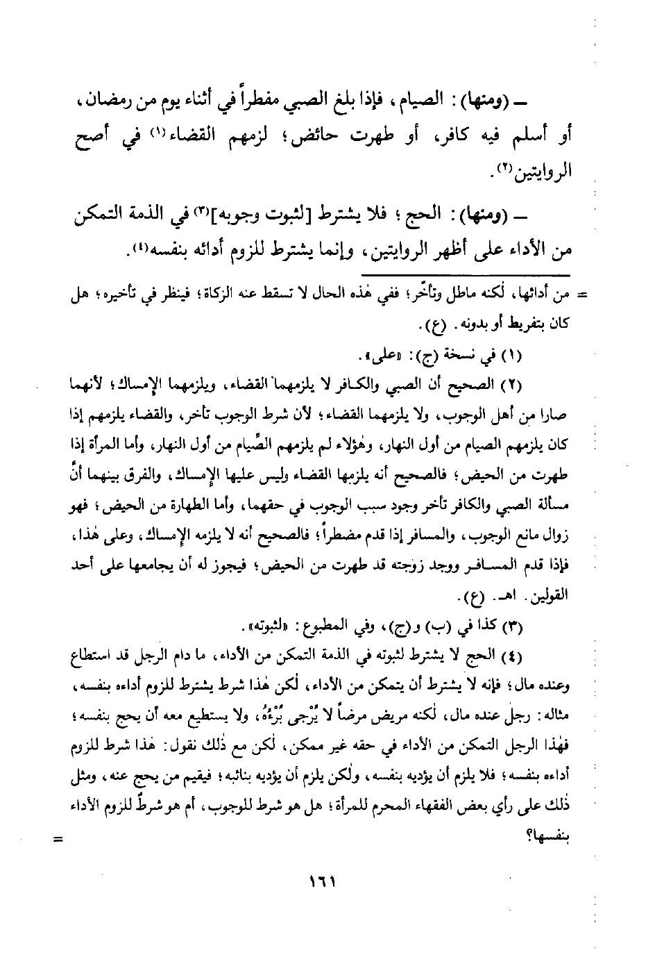 (¬4) الحج لا يشترط لثبوته في الذمة التمكن من الأداء، ما دام الرجل قد استطاع وعنده مال؛ فإنه لا يشترط أن يتمكن من الأداء، لكن هذا شرط يشترط للزوم أداءه بنفسه، مثاله: رجل عنده مال، لكنه مريض مرضًا لا يُرْجى بُرْءُهُ، ولا يستطيع معه أن يحج بنفسه؛ فهذا الرجل التمكن من الأداء في حقه غير ممكن، لكن مع ذلك نقول: هذا شرط للزوم أداءه بنفسه؛ فلا يلزم أن يؤديه بنفسه، ولكن يلزم أن يؤديه بنائبه؛ فيقيم من يحج عنه، ومثل ذلك على رأي بعض الفقهاء المحرم للمرأة؛ هل هو شرط للوجوب، أم هو شرطٌ للزوم الأداء بنفسها؟ =