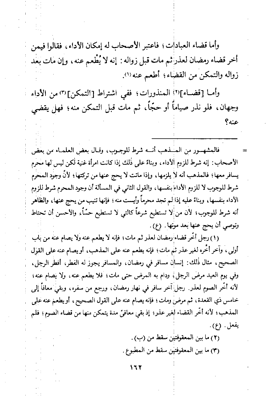 (¬1) رجل أخّر قضاء رمضان لعذر ثم مات؛ فإنه لا يطعم عنه ولا يصام عنه من باب أولى، وآخر أخَّره لغير عذر ثم مات؛ فإنه يطعم عنه على المذهب، أو يصام عنه على القول الصحيح، مثال ذلك: إنسان مسافر في رمضان، والمسافر يجوز له الفطر، أفطر الرجل، وفي يوم العيد مرض الرجل، ودام به المرض حتى مات، فلا يطعم عنه، ولا يصام عنه؛ لأنه أخّر الصوم لعذر. رجل آخر سافر في نهار رمضان، ورجع من سفره، وبقي معافًا إلى خامس ذي القعدة، ثم مرض ومات؛ فإنه يصام عنه على القول الصحيح، أو يطعم عنه على المذهب؛ لأنه أخّر القضاء لغير عذر؛ إذ بقي معافًى مدة يتمكن منها من قضاء الصوم؛ فلم يفعل. (ع).