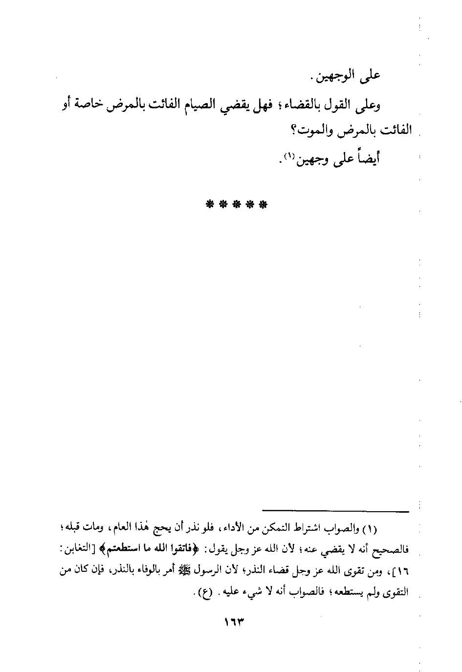 (¬1) والصواب اشتراط التمكن من الأداء، فلو نذر أن يحج هذا العام، ومات قبله؛ فالصحيح أنه لا يقضي عنه؛ لأن اللَّه عز وجل يقول: {فَاتَّقُوا اللَّهَ مَا اسْتَطَعْتُمْ} [التغابن: 16]، ومن تقوى اللَّه عز وجل قضاء النذر؛ لأن الرسول -صلى اللَّه عليه وسلم- أمر بالوفاء بالنذر، فإن كان من التقوى ولم يستطعه، فالصواب أنه لا شيء عليه. (ع).