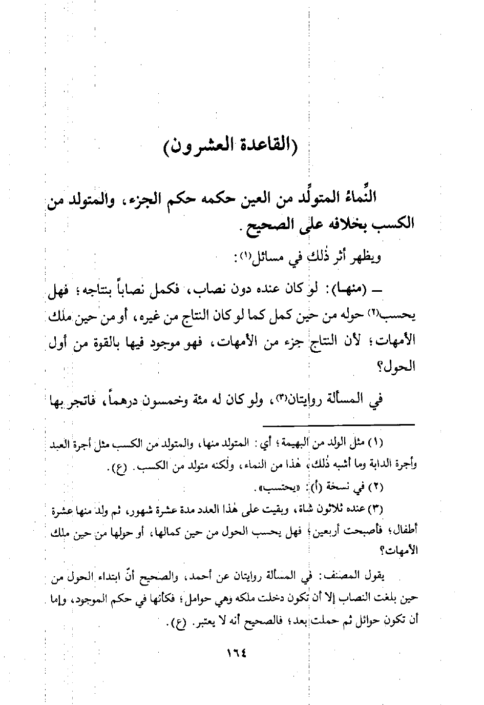 (¬1) مثل الولد من البهيمة، أي: المتولد منها، والمتولد من الكسب مثل أجرة العبد وأجرة الدابة وما أشبه ذلك، هذا من النماء، ولكنه متولد من الكسب. (ع).
