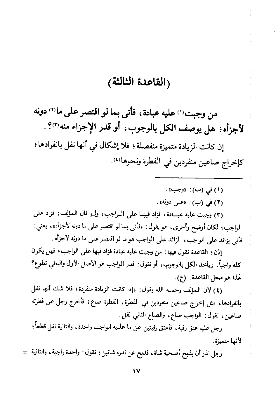 إذن؛ القاعدة نقول فيها: من وجبت عليه عبادة فزاد فيها على الواجب؛ فهل يكون كله واجبًا، ويأخذ الكل بالوجوب، أو نقول: قدر الواجب هو الأصل الأول والباقي تطوع؟ هذا هو محل القاعدة. (ع).