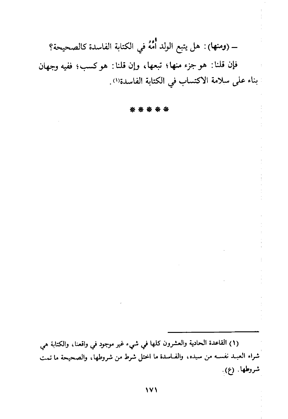 (¬1) القاعدة الحادية والعشرون كلها في شيء غير موجود في واقعنا، والكتابة هي شراء العبد نفسه من سيده، والفاسدة ما اختل شرط من شروطها، والصحيحة ما تمت شروطها. (ع).