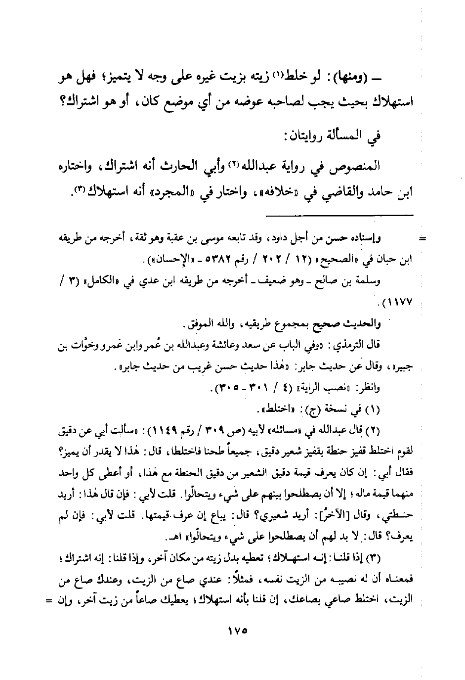 (¬3) إذا قلنا: إنه استهلاك؛ تعطيه بدل زيته من مكان آخر، وإذا قلنا: إنه اشتراك؛ فمعناه أنَّ له نصيه من الزيت نفسه، فمثلًا: عندي صاع من الزيت، وعندك صاع من الزيت، اختلط صاعي بصاعك، إن قلنا بأنَّه استهلاك؛ يعطيك صاعًا من زيت آخر، وإن =
