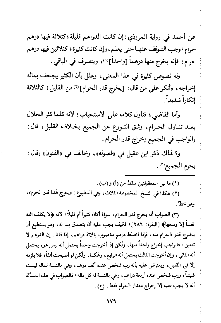 (¬3) الصواب أنه يخرج قدر الحرام، سواءً: أكان كثيرًا أم قليلًا؛ لأنه {لَا يُكَلِّفُ اللَّهُ نَفْسًا إِلَّا وُسْعَهَا} [البقرة: 286]؛ فكيف يجب عبه أن يتصدق بما له، وهو يستطيع أن يخرج قدر الحرام منه، فإذا اختلط درهم مغصوب بثلاثة دراهم، إذا قلنا: إن الدرهم لا تتعين؛ فالواجب إخراج واحدًا منها، ولكن إذا أخرجت واحدًا يحتمل أنه ليس هو، يحتمل أنه الثاني، وإن أخرجت الثالث يحتمل أنه الرابع، وهكذا، ولكن لوأصبحت ألفًا؛ فلا يلزمه إلا في القليل، ويعترض عليه بأنه رب شخص عنده ألف درهم، وهي بالنسبة لماله ليست شيئًا، ورب شخص عنده أربعة دراهم، وهي بالنسبة له كل ماله؛ فالصواب في هذه المسألة أنه لا يجب عليه إلا إخراج مقدار الحرام فقط. (ع).