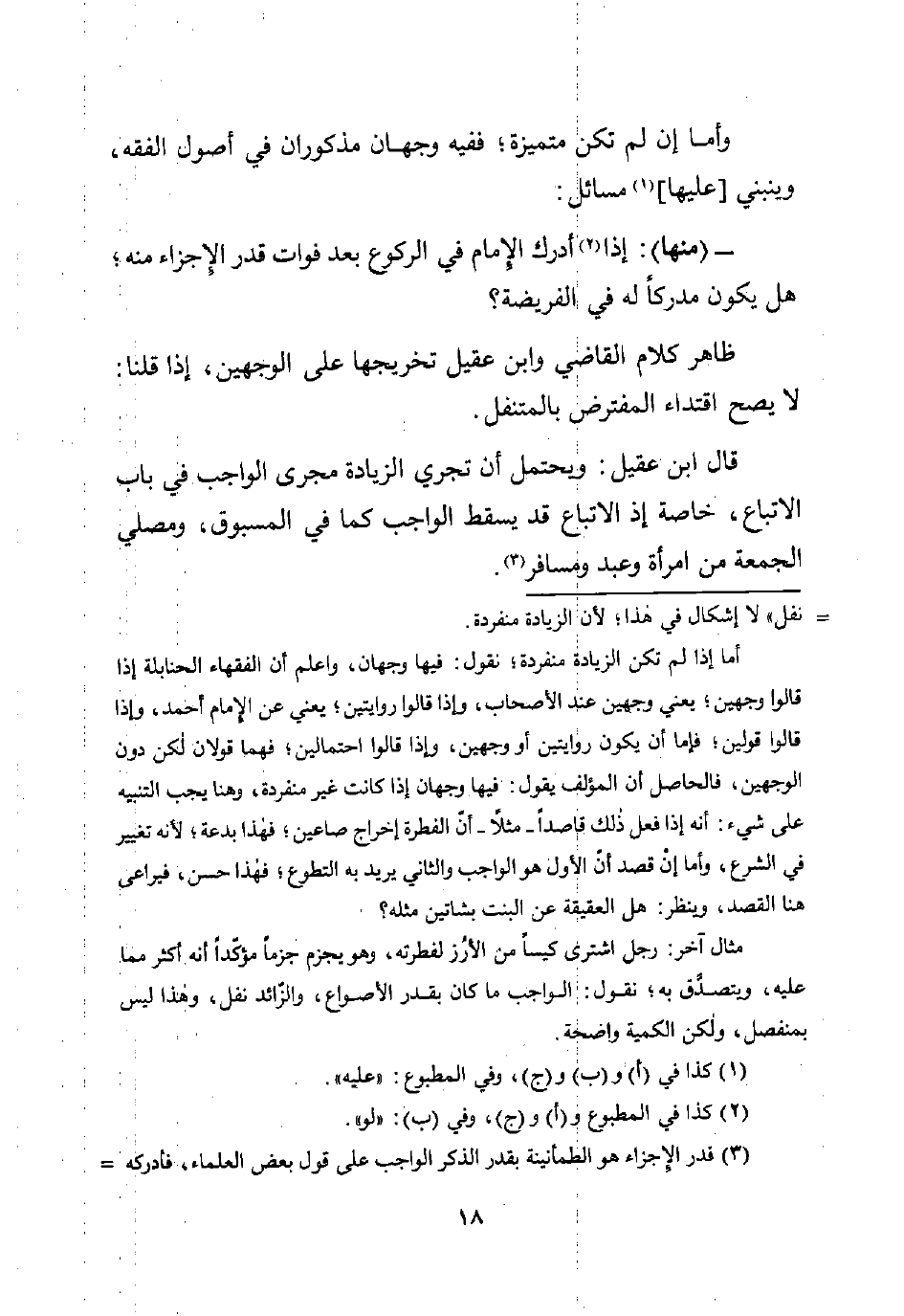 قال ابن عقيل: ويحتمل أن تجري الزيادة مجرى الواجب في باب الاتباع، خاصة إذ الاتباع قد يسقط الواجب كما في المسبوق، ومصلي الجمعة من امرأة وعبد ومسافر (¬3).