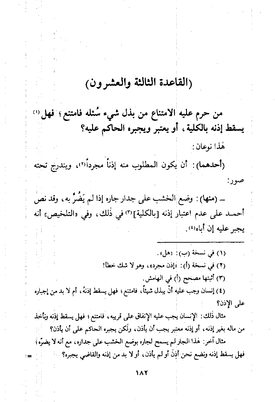 مثال آخر: هذا الجار لم يسمح لجاره بوضع الخشب على جداره، مع أنه لا يضرَّه؛ فهل يسقط إذنه ونضع نحن أذِنَ أو لم يأذن، أو لا بد من إذنه والقاضي يجبره؟ =