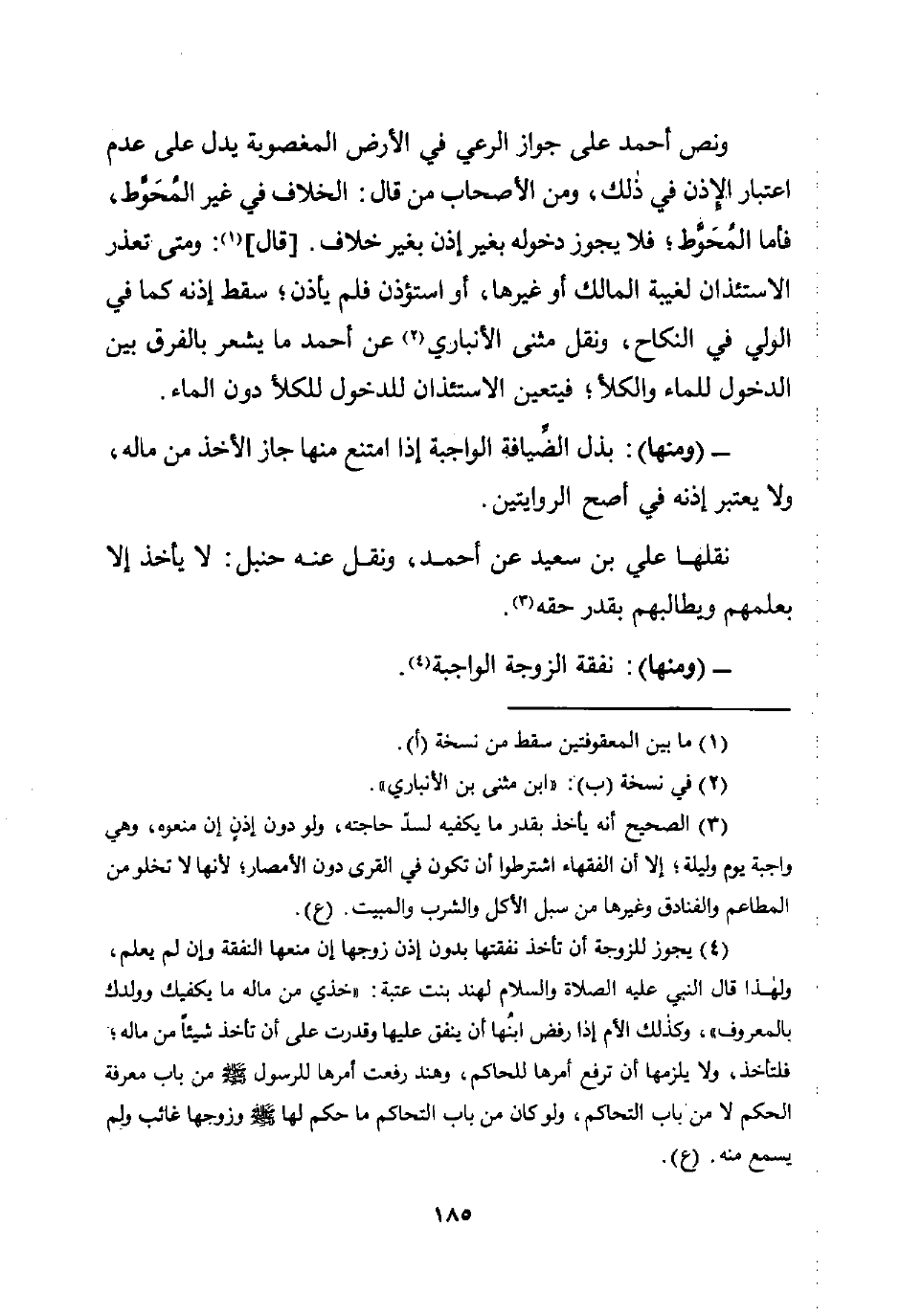 ونص أحمد على جواز الرعي في الأرض المغصوبة يدل على عدم اعتبار الإذن في ذلك، ومن الأصحاب من قال: الخلاف في غير المُحَوَّط، فأما المُحَوَّط؛ فلا يجوز دخوله بغير إذن بغير خلاف. [قال] (¬1): ومتى تعذر الاستئذان لغيبة المالك أو غيرها، أو استؤذن فلم يأذن؛ سقط إذنه كما في الولي في النكاح، ونقل مثنى الأنباري (¬2) عن أحمد ما يشعر بالفرق بين الدخول للماء والكلأ؛ فيتعين الاستئذان للدخول للكلأ دون الماء.
