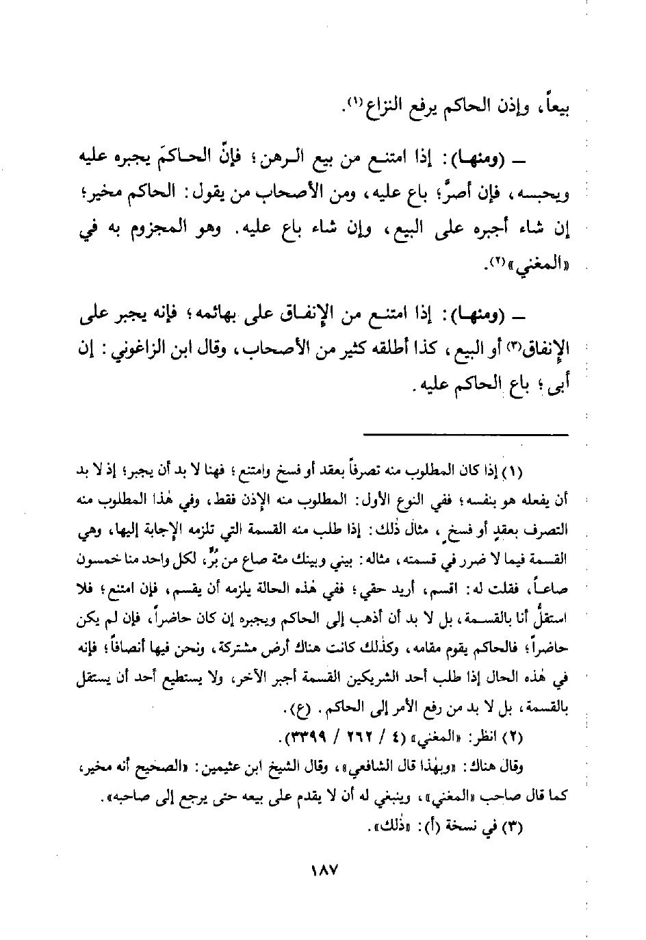 (¬1) إذا كان المطلوب منه تصرفًا بعقد أو فسخ وامتنع، فهنا لا بد أن يجبر؛ إذ لا بد أن يفعله هو بنفسه؛ ففي النوع الأول: المطلوب منه الإذن فقط، وفي هذا المطلوب منه الصرف بعقدٍ أو فسخٍ، مثال ذلك: إذا طب منه القسمة التي تلزمه الإجابة إليها، وهي القسمة فيما لا ضرر في قسمته، مثاله: بيني وبينك مئة صاع من بُرٍّ، لكل واحد منا خمسون صاعًا، فقلت له: اقسم، أريد حقي؛ ففي هذه الحالة يلزمه أن يقسم، فإن امتنع؛ فلا استقلُّ أنا بالقسمة، بل لا بد أن أذهب الى الحاكم ويجبره إن كان حاضرًا، فإن لم يكن حاضرًا، فالحاكم يقوم مقامه، وكذلك كانت هناك أرض مشتركة، ونحن فيها أنصافًا؛ فإنه في هذه الحال إذا طلب أحد الشريكين القسمة أجبر الآخر، ولا يستطيع أحد أن يستقل بالقسمة، بل لا بد من رفع الأمر الى الحاكم. (ع).