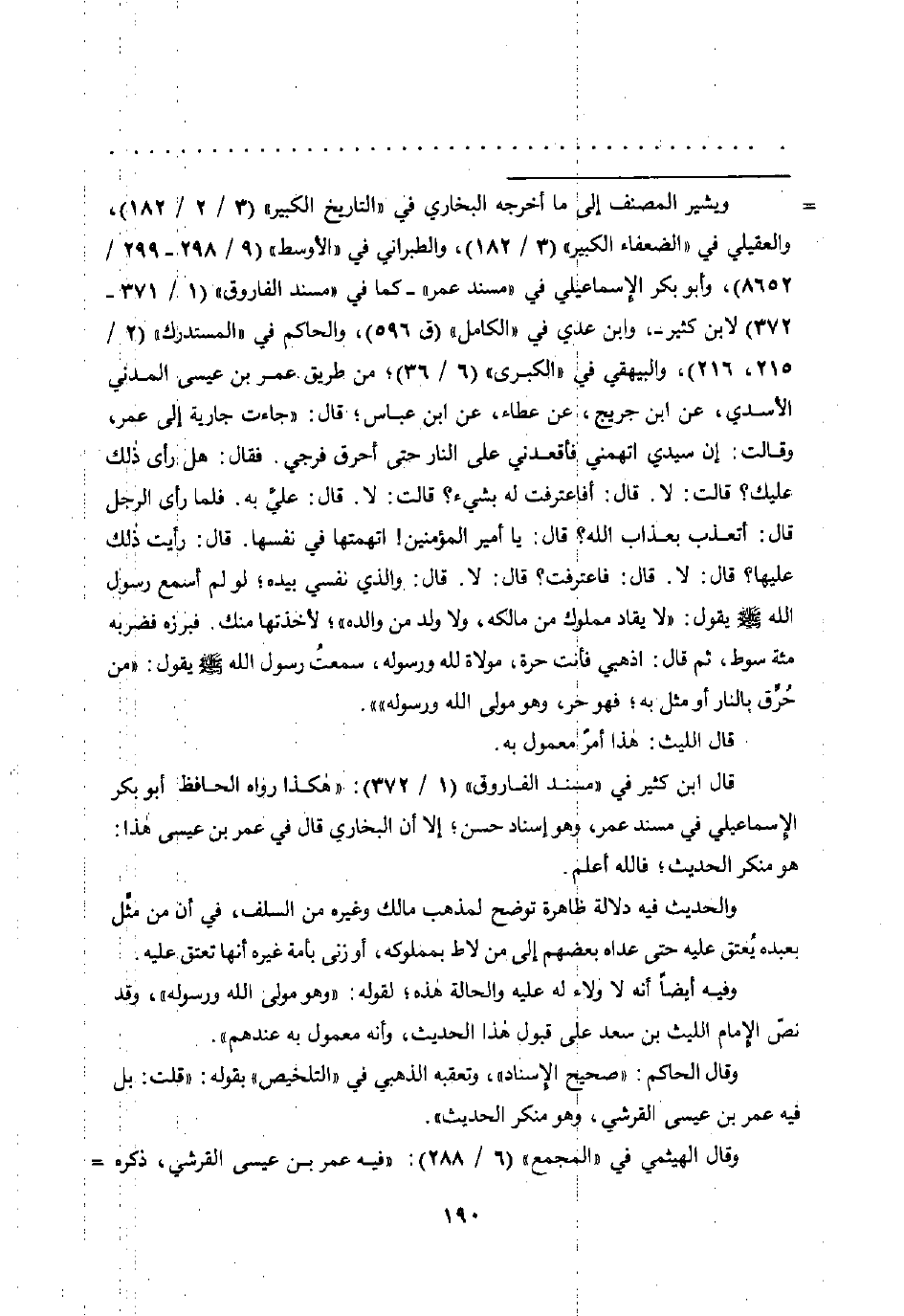 = ويشير المصنف إلى ما أخرجه البخاري في "التاريخ الكبير" (3/ 2/ 182)، والعقيلي في "الضعفاء الكبير" (3/ 182)، والطبراني في "الأوسط" (9/ 298 - 299/ 8652)، وأبو بكر الإسماعيلي في "مسند عمر" -كما في "مسند الفاروق" (1/ 371 - 372) لابن كثير-، وابن عدي في "الكامل" (ق 596)، والحاكم في "المستدرك" (2/ 215، 216)، والبيهقي في "الكبرى" (6/ 36)؛ من طريق عمر بن عيسى المدني الأسدي، عن ابن جريج، عن عطاء، عن ابن عباس؛ قال: "جاءت جارية إلى عمر، وقالت: إن سيدي اتهمني فأقعدني على النار حتى أحرق فرجي. فقال: هل رأى ذلك عليك؟ قالت: لا. قال: أفاعترفت له بشيء؟ قالت: لا. قال: عليَّ به. فلما رأى الرجل قال: أتعذب بعذاب اللَّه؟ قال: يا أمر المؤمنين! اتهمتها في نفسها. قال: رأيت ذلك عليها؟ قال: لا. قال: فاعترفت؟ قال: لا. قال: والذي نفسي بيده، لو لم أسمع رسول اللَّه -صلى اللَّه عليه وسلم- يقول "لا يقاد مملوك من مالكه، ولا ولد من والده"؛ لأخذتها منك. فبرزه فضربه مئة سوط، ثم قال: اذهبي فأنت حرة، مولاة للَّه ورسوله، سمعتُ رسول اللَّه -صلى اللَّه عليه وسلم- يقول: "من حُرِّق بالنار أو مثل به، فهو حر، وهو مولى اللَّه ورسوله"".