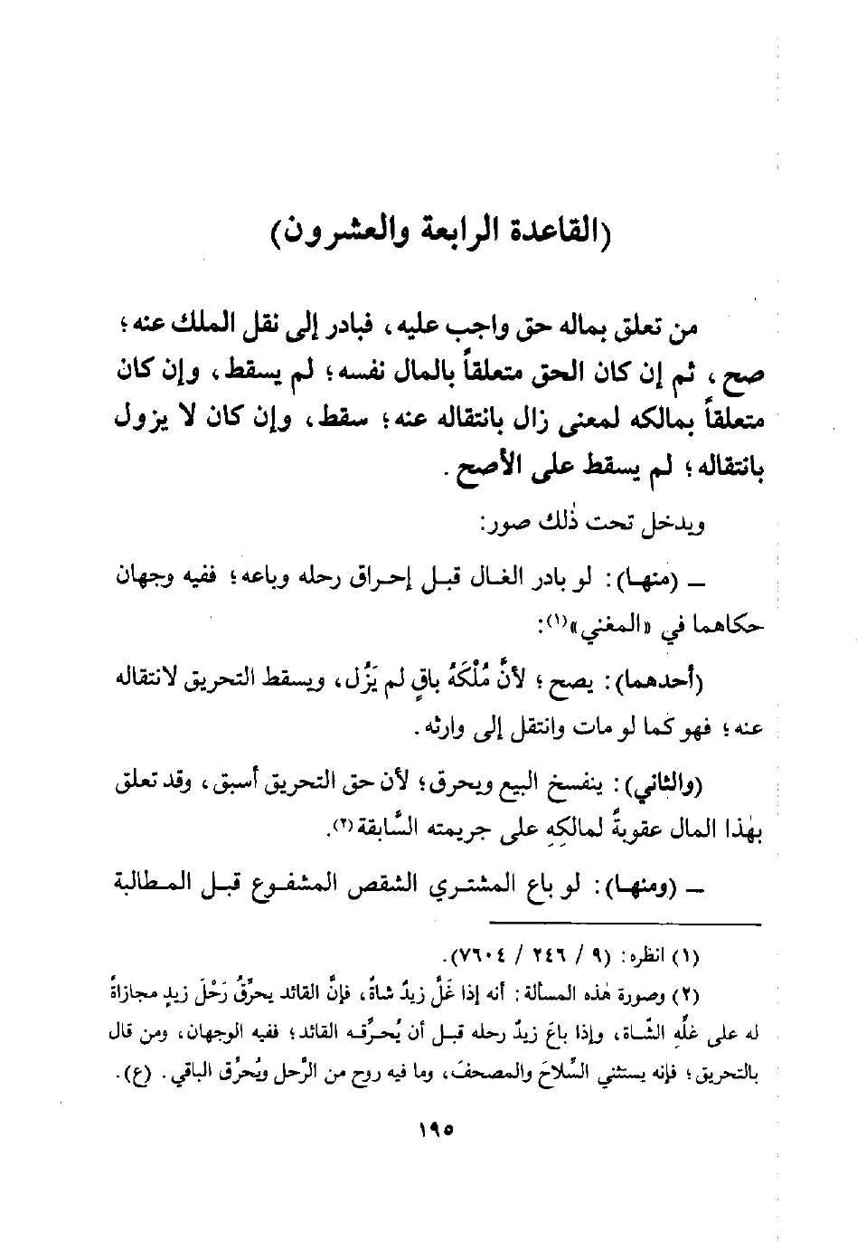 (¬2) وصورة هذه المسألة: أنه إذا غَلَّ زيدٌ شاةٌ، فإنَّ القائد يحرِّقُ رَحْلَ زيدٍ مجازاةً له على غلِّهِ الشَّاة، وإذا باعَ زيدٌ رحله قبل أن يُحرِّقه القائد؛ ففيه الوجهان، ومن قال بالتحريق؛ فإنه يستثني السِّلاحَ والمصحفَ، وما فيه روح من الرَّحل ويُحرِّق الباقي. (ع).