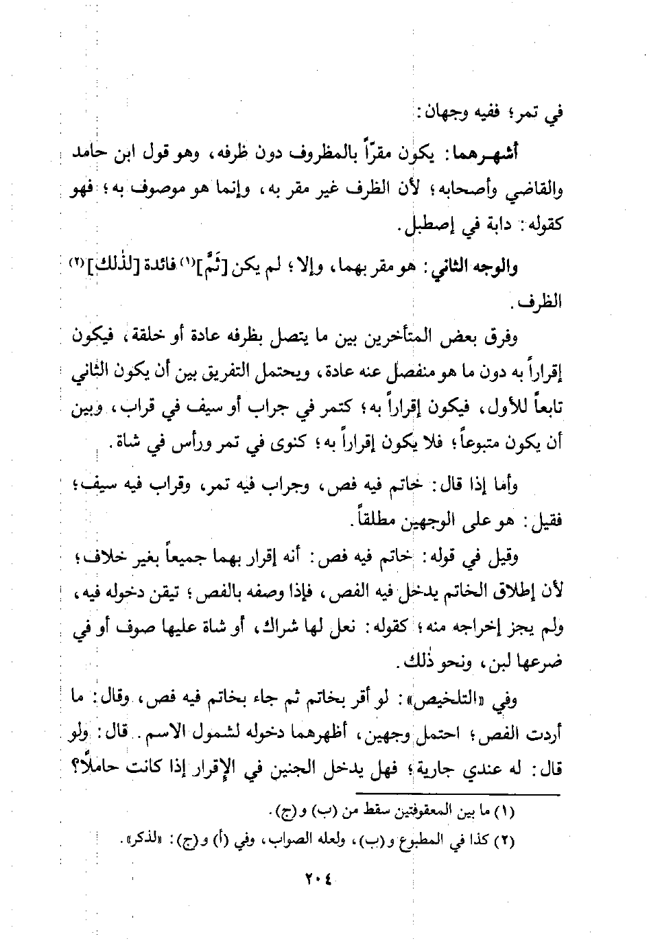 وقيل في قوله: خاتم فيه فص: أنه إقرار بهما جميعًا بغير خلاف؛ لأن إطلاق الخاتم يدخل فيه الفص، فإذا وصفه بالفص، تيقن دخوله فيه، ولم يجز إخراجه منه؛ كقوله: نعل لها شراك، أو شاة عليها صوف أو في ضرعها لبن، ونحو ذلك.
