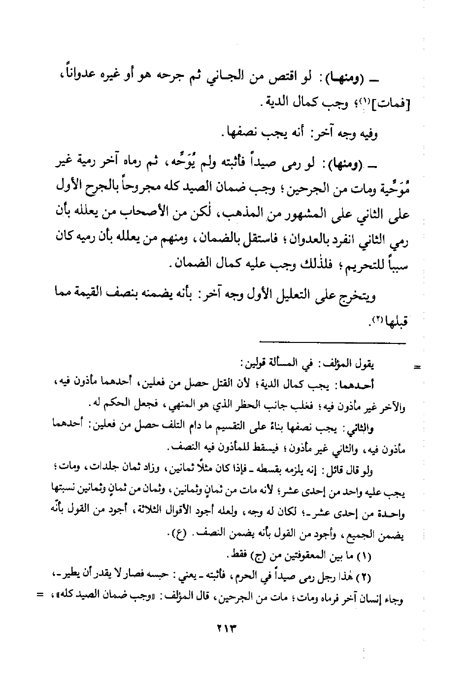 - (ومنها): لو رمى صيدًا فأثبته ولم يُوَحِّه، ثم رماه آخر رمية غير مُوَحِّية ومات من الجرحين؛ وجب ضمان الصيد كله مجروحًا بالجرح الأول على الثاني على المشهور من المذهب، لكن من الأصحاب من يعلله بأن رمي الثاني انفرد بالعدوان؛ فاستقل بالضمان، ومنهم من يعلله بأن رميه كان سببًا للتحريم؛ فلذلك وجب عليه كمال الضمان.