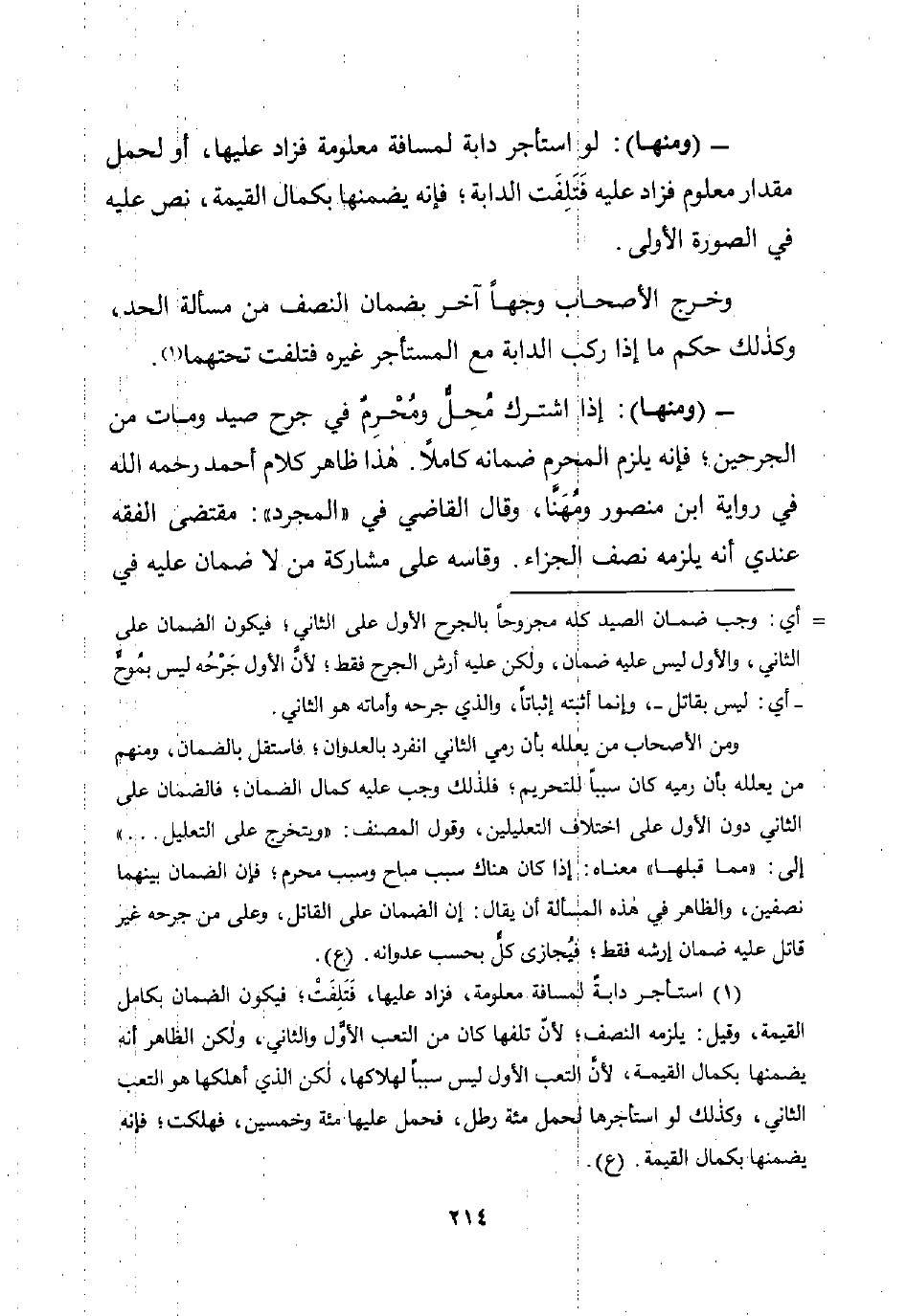 - (ومنها): إذا اشترك مُحِلٌّ ومُحْرِمٌ في جرح صيد ومات من الجرحين؛ فإنه يلزم المحرم ضمانه كاملًا. هذا ظاهر كلام أحمد رحمه اللَّه في رواية ابن منصور ومُهَنَّا، وقال القاضي في "المجرد": مقتضى الفقه عندي أنه يلزمه نصف الجزاء. وقاسه على مشاركة من لا ضمان عليه في
