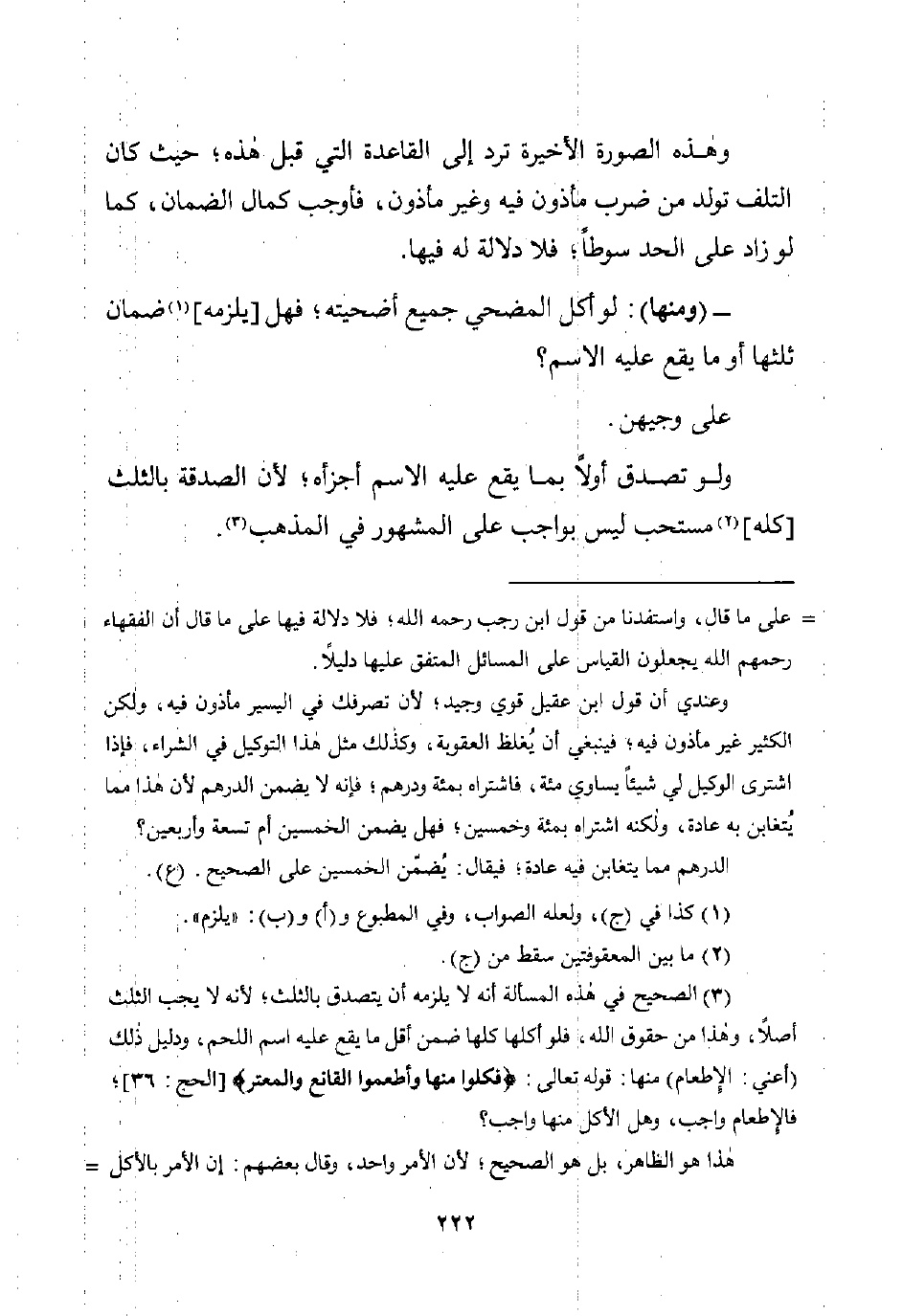 (¬3) الصحيح في هذه المسألة أنه لا يلزمه أن يتصدق بالثلث؛ لأنه لا يجب الثلث أصلًا، وهذا من حقوق اللَّه، فلو أكلها كلها ضمن أقل ما يقع عليه اسم اللحم، ودليل ذلك (أعني: الإطعام) منها: قوله تعالى: {فَكُلُوا مِنْهَا وَأَطْعِمُوا الْقَانِعَ وَالْمُعْتَرَّ} [الحج: 36]؛ فالإطعام واجب، وهل الأكل منها واجب؟