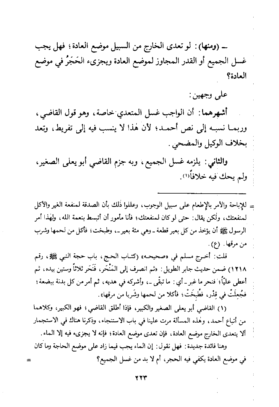 (¬1) القاضي أبو يعلى الصغير والكبير، فإذا أطلق القاضي، فهو الكبير، وكلاهما من أتباع أحمد، وهذه المسألة مرت علينا في باب الاستنجاء، وذكرنا هناك في الاستجمار ألا يتعدى الخارج موضع العادة، فإن تعدى موضع العادة؛ فإنه لا يجزئ فيه إلا الماء.