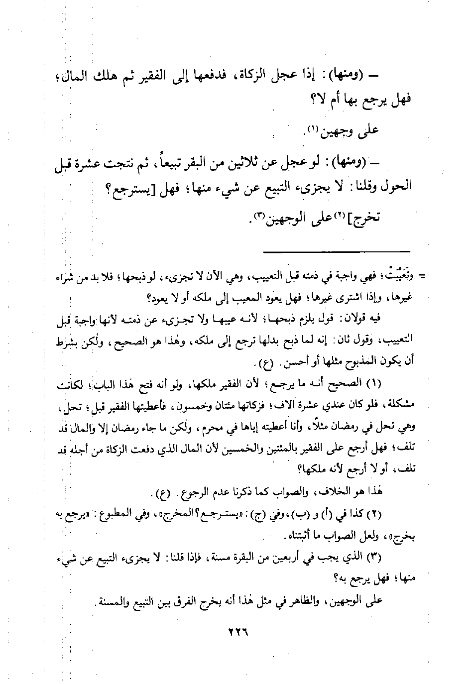 (¬1) الصحيح أنه ما يرجع؛ لأن الفقير ملكها، ولو أنه فتح هذا الباب؛ لكانت مشكلة، فلو كان عندي عشرة آلاف؛ فزكاتها مئتان وخمسون، فأعطيتها الفقير قبل؛ تحل، وهي تحل في رمضان مثلًا، وأنا أعطته إياها في محرم، ولكن ما جاء رمضان إلا والمال قد تلف؛ فهل أرجع على الفقير بالمئتين والخمسين لأن المال الذي دفعت الزكاة من أجله قد تلف، أو لا أرجع لأنه ملكها؟
