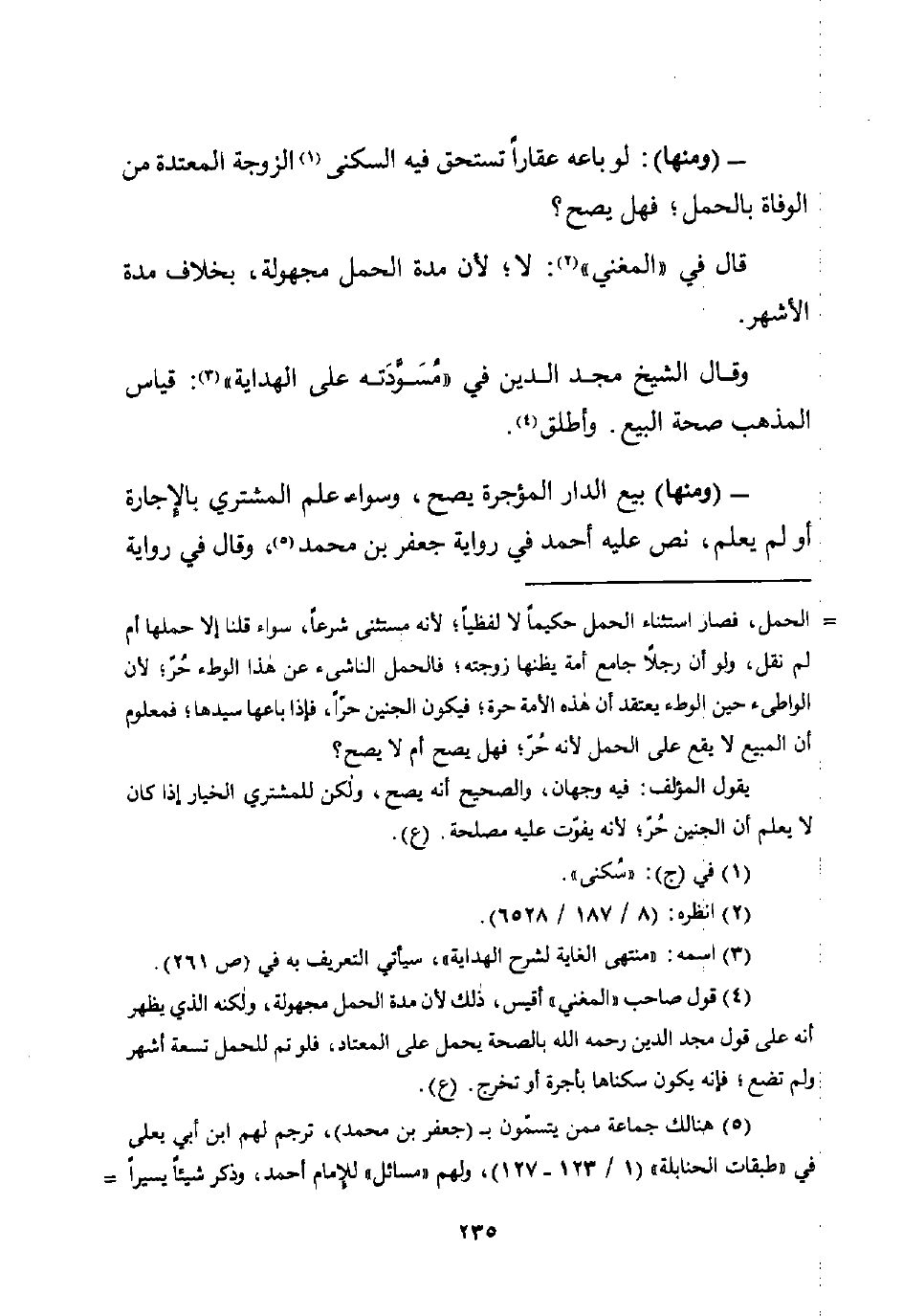 (¬4) قول صاحب "المغني" أقيس، ذلك لأن مدة الحمل مجهولة، ولكنه الذي يظهر أنه على قول مجد الدين رحمه اللَّه بالصحة يحمل على المعتاد، فلو تم للحمل تسعة أشهر ولم تضع؛ فإنه يكون سكناها بأجرة أو تخرج. (ع).