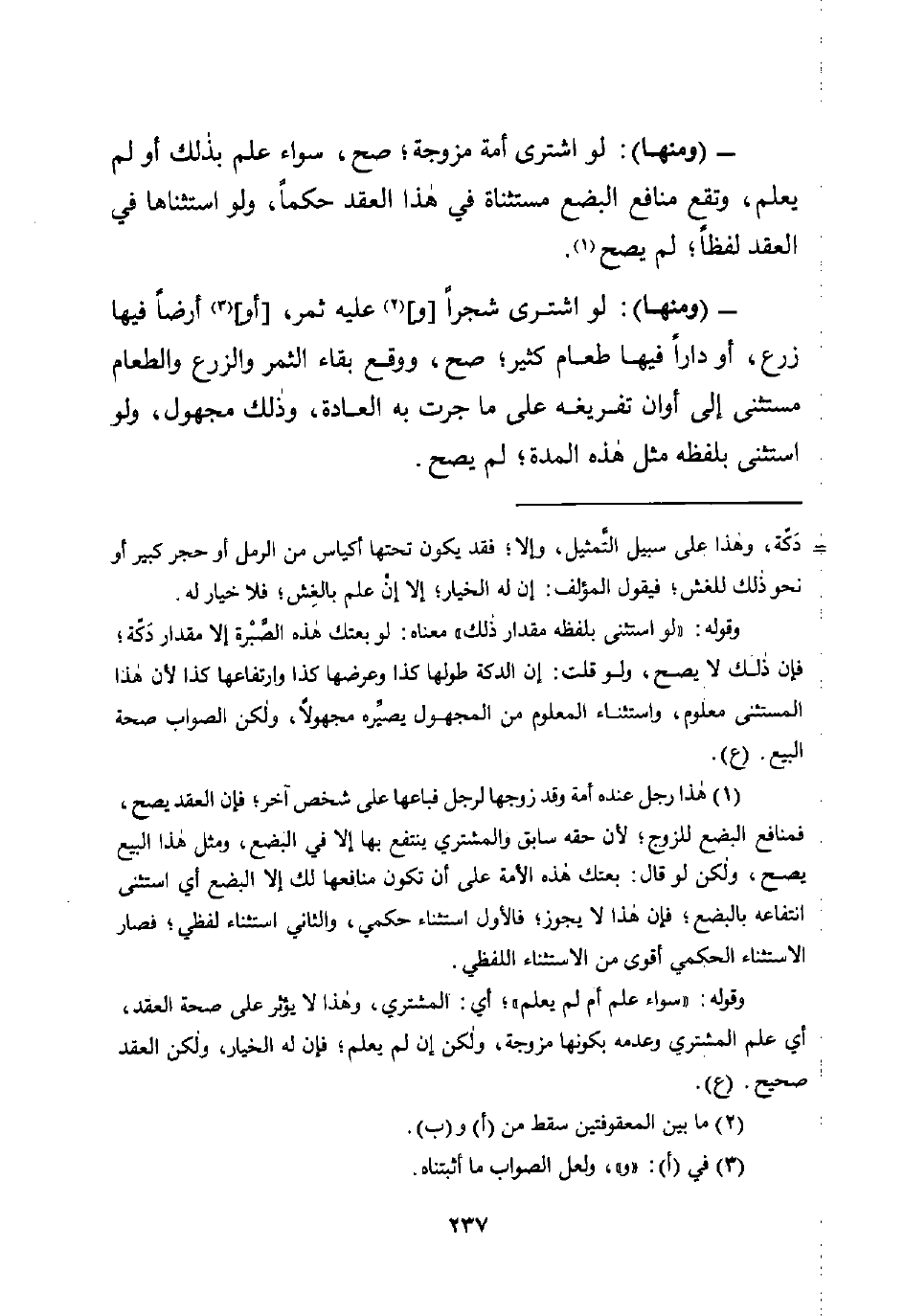 (¬1) هذا رجل عنده أمة وقد زوجها لرجل فباعها على شخص آخر؛ فإن العقد يصح، فمنافع البضع للزوج؛ لأن حقه سابق والمشتري ينتفع بها إلا في البضع، ومثل هذا البيع يصح، ولكن لو قال: بعتك هذه الأمة على أن تكون منافعها لك إلا البضع أي استثنى انتفاعه بالبضع؛ فإن هذا لا يجوز؛ فالأول الثناء حكمي، والثاني استثناء لفظي؛ فصار الاستثناء الحكمي أقوى من الاستثناء اللفظي.