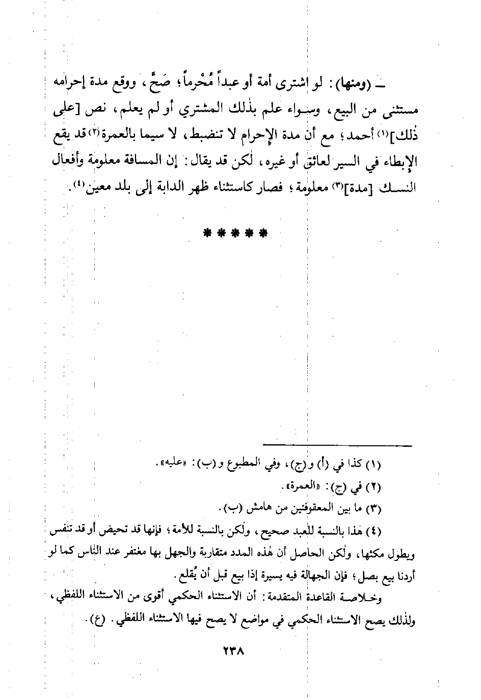 - (ومنها): لو اشترى أمة أو عبدًا مُحرمًا؛ صَحَّ، ووقع مدة إحرامه مستثنى من البيع، وسواء علم بذلك المشتري أو لم يعلم، نص [على ذلك] (¬1) أحمد؛ مع أن مدة الإحرام لا تنضبط، لا سيما بالعمرة (¬2) قد يقع الإبطاء في السير لعائق أو غيره، لكن قد يقال: إن المسافة معلومة وأفعال النسك [مدة] (¬3) معلومة؛ فصار كاستثناء ظهر الدابة إلى بلد معين (¬4).