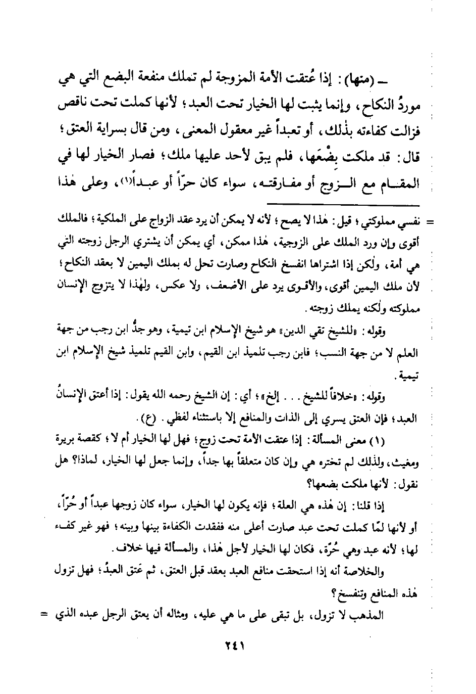 (¬1) معنى المسألة: إذا عتقت الأمة تحت زوج؛ فهل لها الخيار أم لا؛ كقصة بريرة ومغيث، ولذلك لم تختره هي وإن كان متعلقًا بها جدًّا، وإنما جعل لها الخيار، لماذا؟ هل نقول: لأنها ملكت بضعها؟