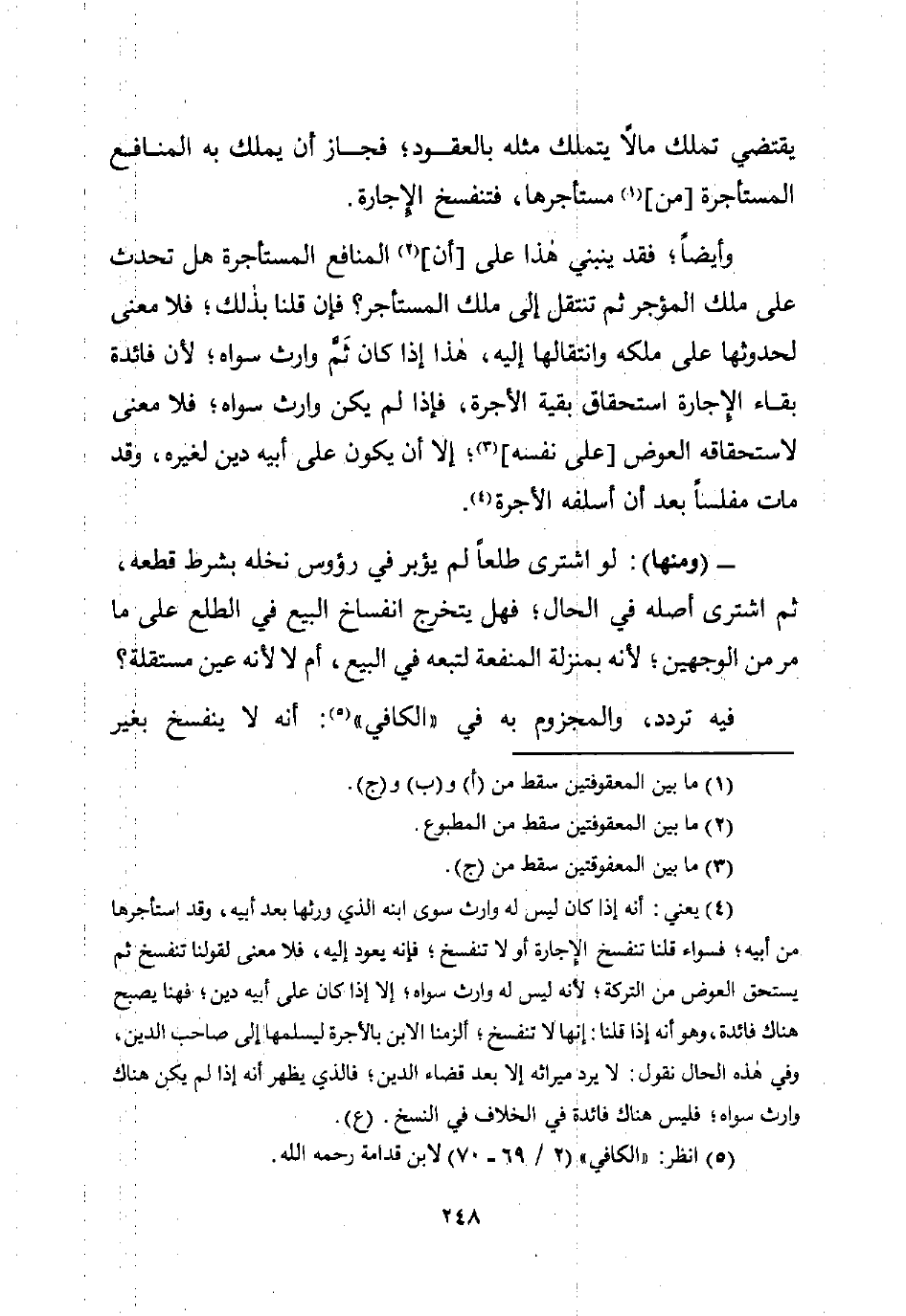 (¬4) يعني: أنه إذا كان ليس له وارث سوى ابنه الذي ورثها بعد أبيه، وقد أستأجرها من أبيه؛ فسواء قلنا تنفسخ الإجارة أو لا تنفسخ؛ فإنه يعود إليه، فلا معنى لقولنا تنفسخ ثم يستحق العوض من التركة؛ لأنه ليس له وارث سواه؛ إلا إذا كان على أبيه دين؛ فهنا يصبح هناك فائدة، وهو أنه إذا قلنا: إنها لا تنفسخ؛ ألزمنا الابن بالأجرة ليسلمها إلى صاحب الدين، وفي هذه الحال نقول: لا يرد ميراثه إلا بعد قضاء الدين؛ فالذي يظهر أنه إذا لم يكن هناك وارث سواه؛ فليس هناك فائدة في الخلاف في النسخ. (ع).