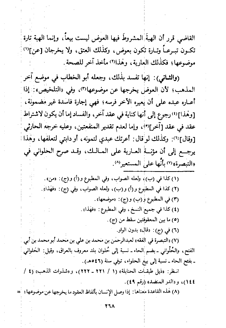 (¬7) "التبصرة في الفقه" لعبد الرحمن بن محمد بن علي بن محمد أبو محمد بن أبي الفغ، والحُلْواني -بضم الحاء- نسبة إلى حُلوان بلد معروف بالعراق، وقيل: الحَلواني -بفتح الحاء- نسبة إلى بيع الحلواء، توفي سنة (546 هـ).