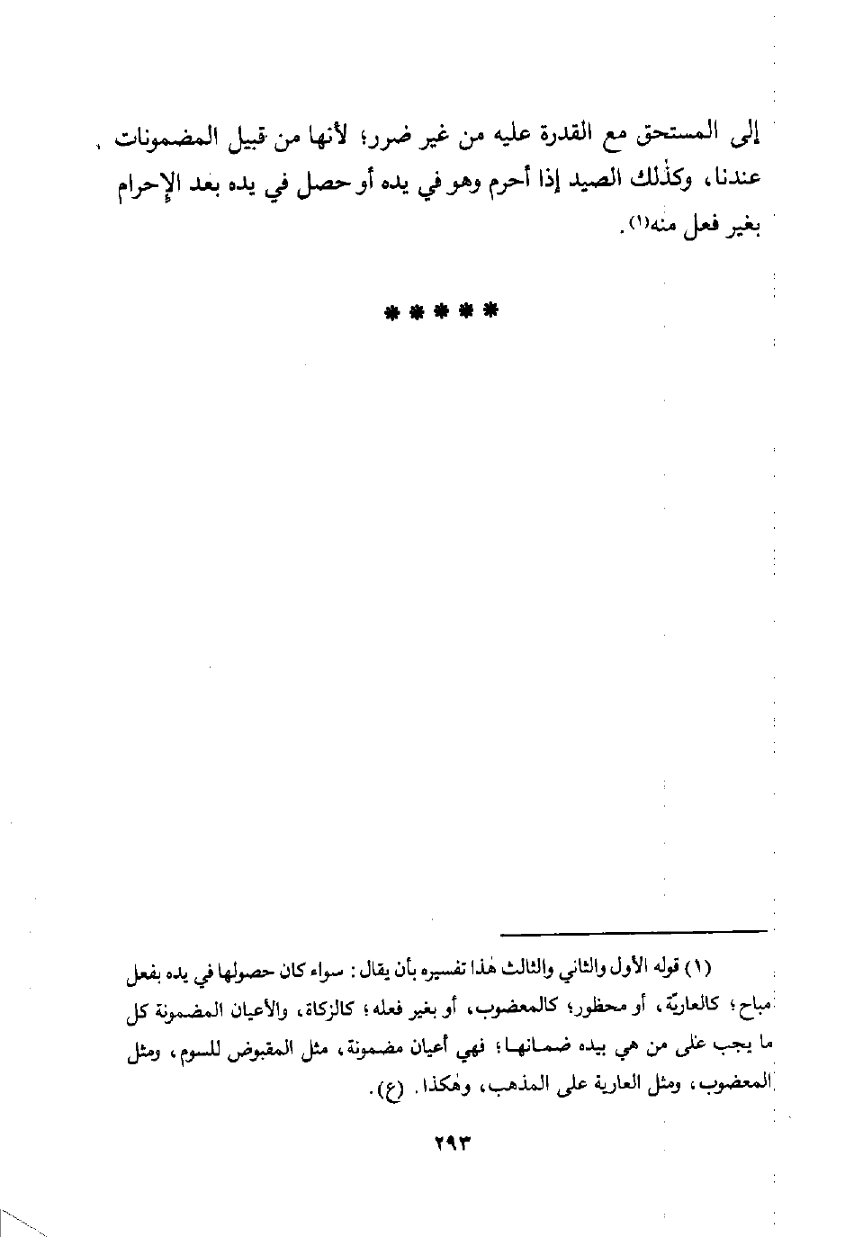 (¬1) قوله الأول والثاني والثالث هذا تفسيره بأن يقال: سواء كان حصولها في يده بفعل مباح؛ كالعاريّة، أو محظور، كالمعضوب، أو بغير فعله؛ كالزكاة، والأعيان المضمونة كل ما يجب على من هي يده ضمانها؛ فهي أعيان مضمونة، مثل المقبوض للسوم، ومثل المعضوب، ومثل العارية على المذهب، وهكذا. (ع).