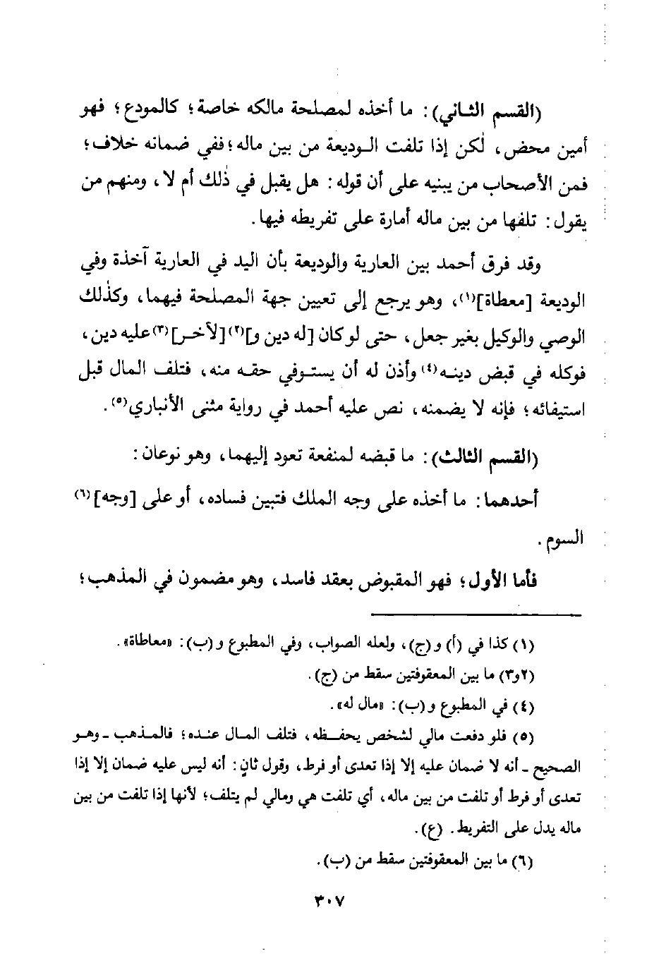 (¬5) فلو دفعت مالي لشخص يحفظه، فتلف المال عنده؛ فالمذهب -وهو الصحيح- أنه لا ضمان عليه إلا إذا تعدى أو فرط، وقول ثانٍ: أنه ليس عليه ضمان إلا إذا تعدى أو فرط أو تلفت من بين ماله، أي تلفت هي ومالي لم يتلف؛ لأنها إذا تلفت من بين ماله يدل على التفريط. (ع).