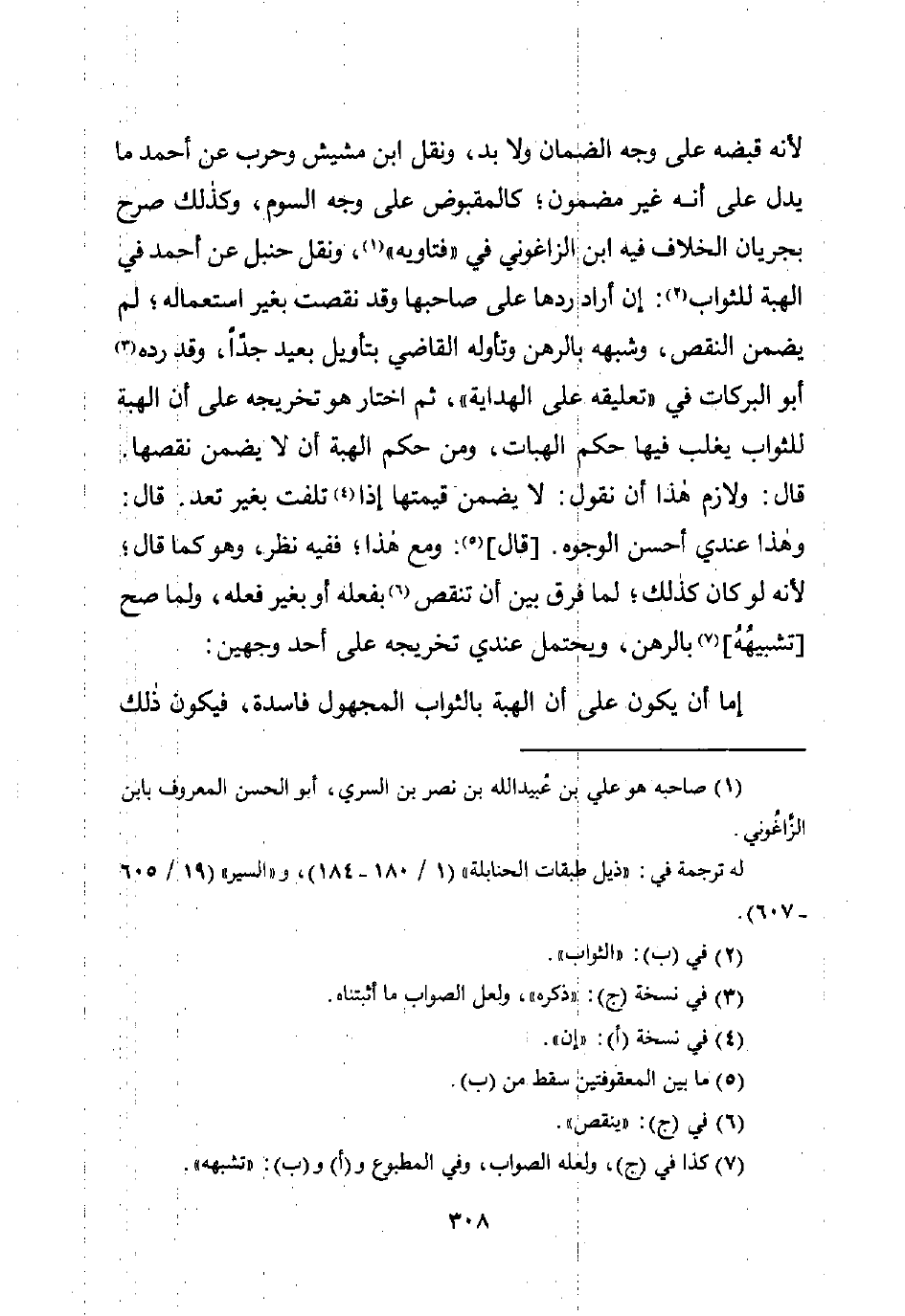 لأنه قبضه على وجه الضمان ولا بد، ونقل ابن مشيش وحرب عن أحمد ما يدل على أنه غير مضمون؛ كالمقبوض على وجه السوم، وكذلك صرح بجريان الخلاف فيه ابن الزاغوني في "فتاويه" (¬1)، ونقل حنبل عن أحمد في الهبة للثواب (¬2): إن أراد ردها على صاحبها وقد نقصت بغير استعماله؛ لم يضمن النقص، وشبهه بالرهن وتأوله القاضي بتأويل بعيد جدًّا، وقد رده (¬3) أبو البركات في "تعليقه على الهداية"، ثم اختار هو تخريجه على أن الهبة للثواب يغلب فيها حكم الهبات، ومن حكم الهبة أن لا يضمن نقصها. قال: ولازم هذا أن نقول: لا يضمن قيمتها إذا (¬4) تلفت بغير تعد. قال: وهذا عندي أحسن الوجوه. [قال] (¬5): ومع هذا؛ ففيه نظر، وهو كما قال؛ لأنه لو كان كذلك؛ لما فرق بين أن تنقص (¬6) بفعله أو بغير فعله، ولما صح [تشبيهُهُ] (¬7) بالرهن، ويحتمل عندي تخريجه على أحد وجهين: