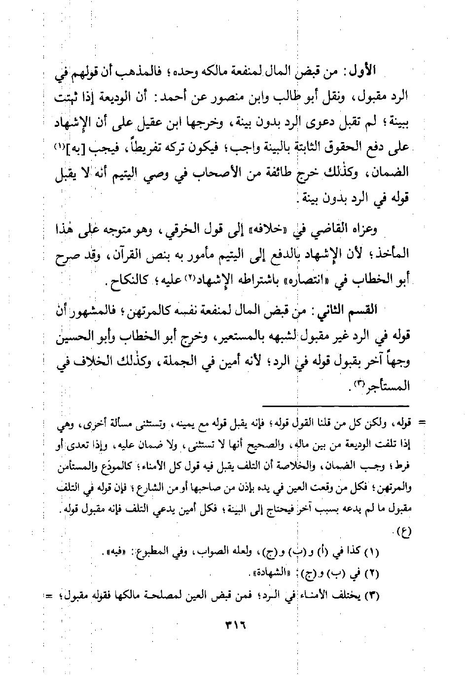 الأول: من قبض المال لمنفعة مالكه وحده؛ فالمذهب أن قولهم في الرد مقبول، ونقل أبو طالب وابن منصور عن أحمد: أن الوديعة إذا ثبتت ببينة؛ لم تقبل دعوى الرد بدون بينة، وخرجها ابن عقيل على أن الإشهاد على دفع الحقوق الثابتة بالبينة واجب؛ فيكون تركه تفريطًا، فيجب [به] (¬1) الضمان، وكذلك خرج طائفة من الأصحاب في وصي اليتيم أنه لا يقبل قوله في الرد بدون بينة.