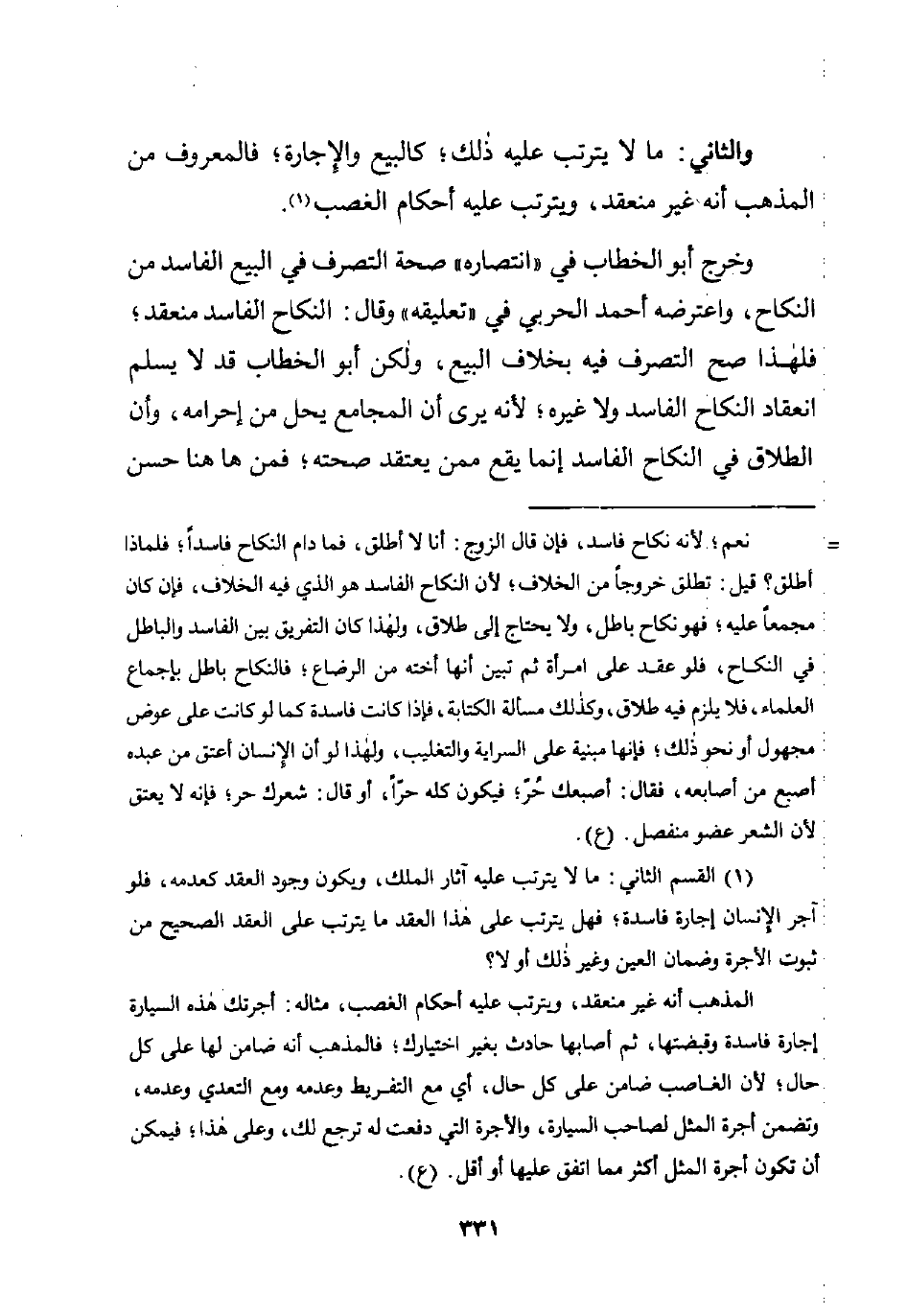والثاني: ما لا يترتب عليه ذلك؛ كالبيع والإِجارة؛ فالمعروف من المذهب أنه غير منعقد، ويترتب عليه أحكام الغصب (¬1).