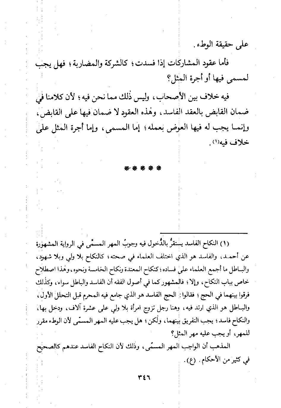 (¬1) النكاح الفاسد يستقرُّ بالدُّخول فيه وجوبُ المهر المسمَّى في الرواية المشهورة عن أحمد، والفاسد هو الذي اختلف العلماء في صحته؛ كالنكاح بلا ولي وبلا شهود، والباطل ما أجمع العلماء على فساده؛ كنكاح المعتدة ونكاح الخامسة ونحوه، وهذا اصطلاح خاص بباب النكاح، وإلا؛ فالمشهور كما في أصول الفقه أن الفاسد والباطل سواء، وكذلك فرقوا بينهما في الحج؛ فقالوا: الحج الفاسد هو الذي جامع فيه المحرم قبل التحلل الأول، والباطل هو الذي ارتد فيه، وهنا رجل تزوج امرأة بلا ولي على عشرة آلاف، ودخل بها، والنكاح فاسد؛ يجب التفريق بينهما، ولكن؛ هل يجب عليه المهر المسمّى لأن الوطء مقرر للمهر، أو يجب عليه مهر المثل؟