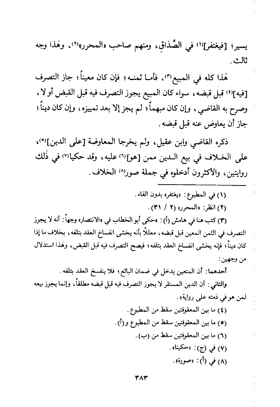 (¬3) كتب هنا في هامش (أ): "حكى أبو الخطاب في "الانتصار" وجهًا: أنه لا يجوز التصرف في الثمن المعين فبل قضه، معللًا بأنه يخشى انفساخ العقد بتلفه، بخلاف ما إذا كان دينًا؛ فإنه يخشى انفساخ العقد بتلفه؛ فيصح التصرف فيه قبل القبض، وهذا استدلال من وجهين: