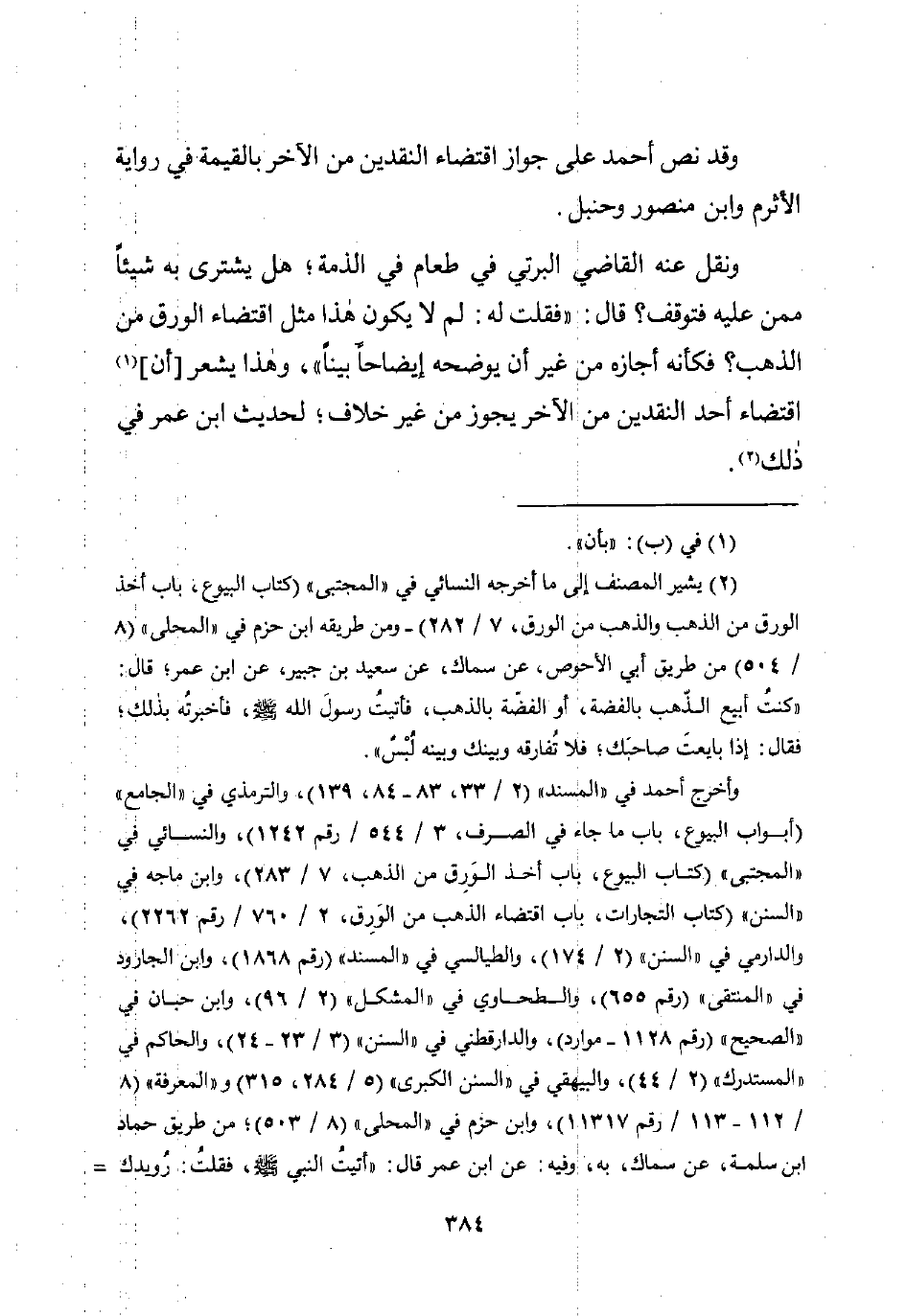 (¬2) يشير المصنف إلى ما أخرجه النسائي في "المجتبى" (كتاب البيوع، باب أخذ الورق من الذهب والذهب من الورق، 7/ 282) -ومن طريقه ابن حزم في "المحلى" (8/ 504) من طريق أبي الأحوص، عن سماك، عن سعيد بن جبير، عن ابن عمر؛ قال: "كنتُ أبيع الذّهب بالفضة، أو الفضّة بالذهب، فأتيتُ رسولَ اللَّه -صلى اللَّه عليه وسلم-، فأخبرته بذلك؛ فقال: إذا بايعتَ صاحبَك؛ فلا تُفارته وبينك وبينه لُبْسٌ".